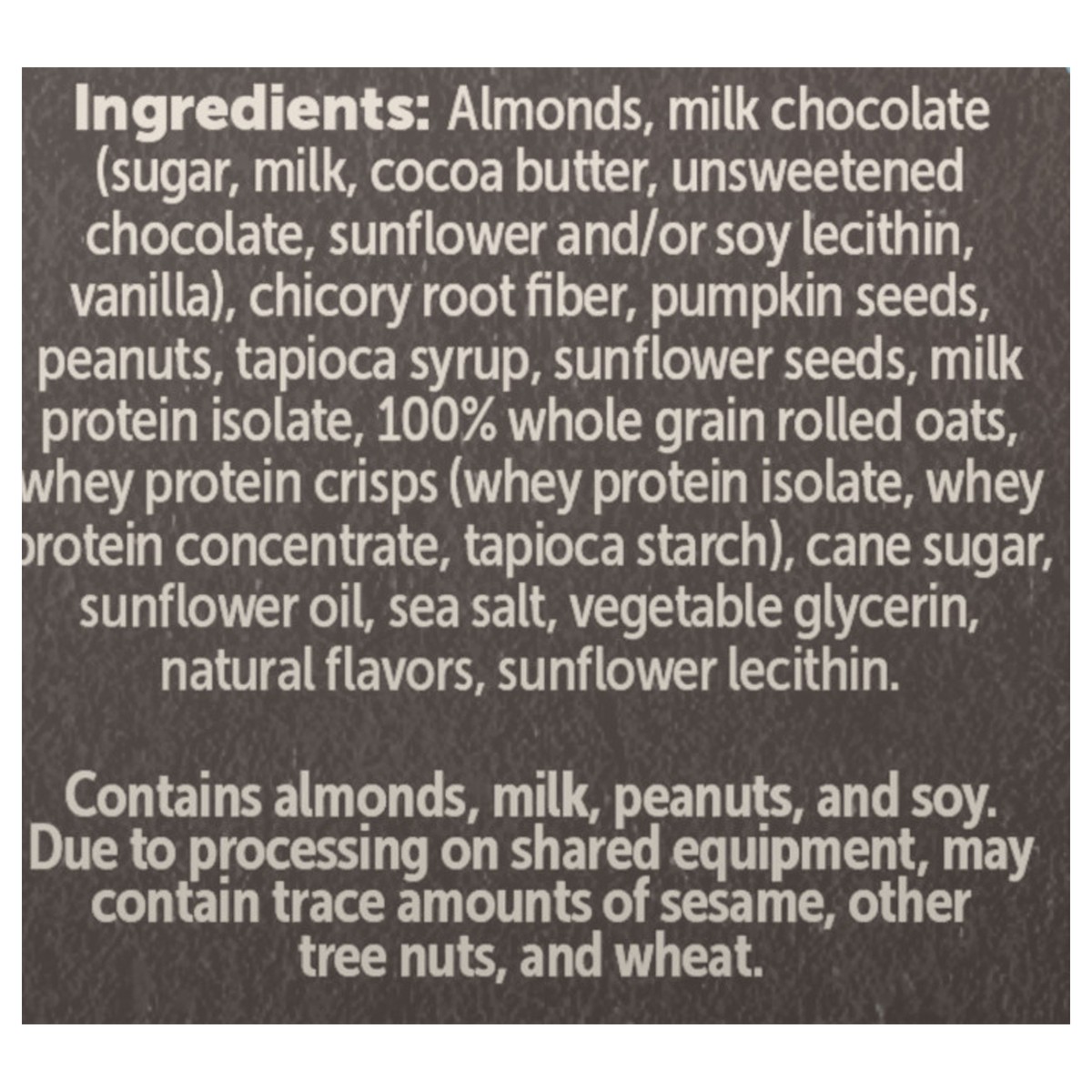 Almonds, Milk Chocolate (Sugar, Milk, Cocoa Butter, Unsweetened Chocolate, Sunflower and/or Soy Lecithin, Vanilla), Chicory Root Fiber, Pumpkin Seeds, Peanuts, Tapioca Syrup, Sunflower Seeds, Milk Pro…