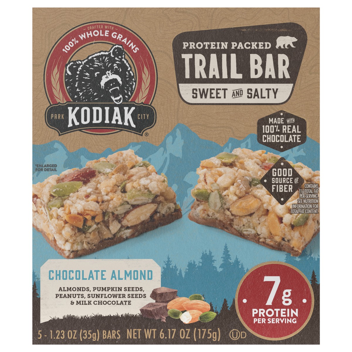 Kodiak Chocolate Almond Trail Bar has 7g of Protein, 100% Whole Grains Premium Ingredients including 100% Real Milk Chocolate Bottom