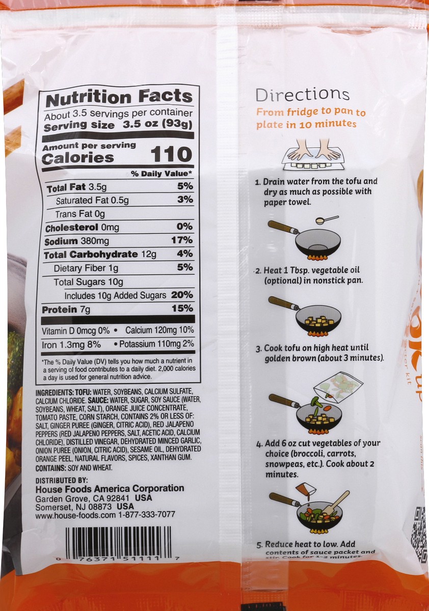 Tofu: Water, Soybeans, Calcium Sulfate, Calcium Chloride. Sauce: Water, Sugar, Soy Sauce (Water, Soybeans, Wheat, Salt), Orange Juice Concentrate, Tomato Paste, Corn Starch, Contains 2% or Less of: Sa…