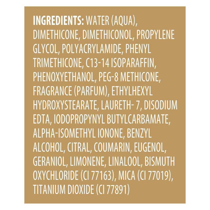 Water (Aqua), Dimethicone, Dimethiconol, Propylene Glycol, Polyacrylamide, Phenyl Trimethicone, C13-14 Isoparaffin, Phenoxyethanol, PEG-8 Methicone, Fragrance (Parfum), Ethylhexyl Hydroxystearate, Lau…