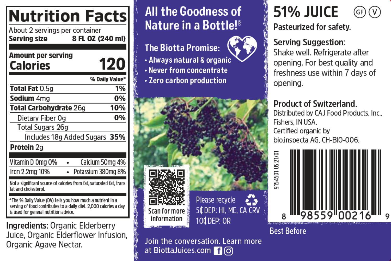 Organic Elderberry Juice, Organic Elderflower Infusion, Organic Agave Nectar.