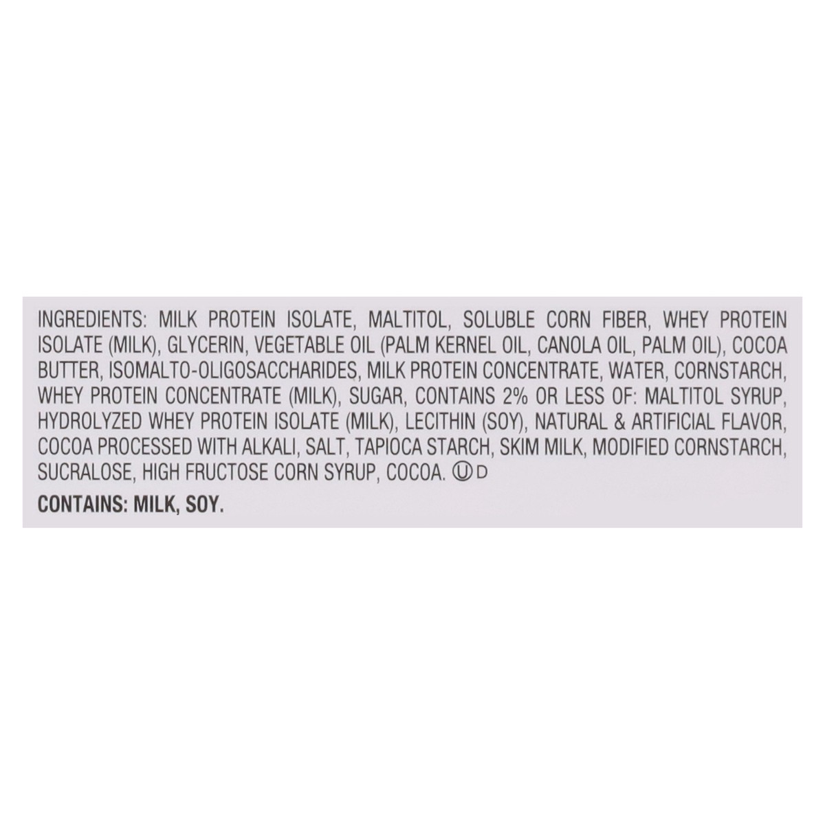 Milk Protein Isolate, Maltitol, Soluble Corn Fiber, Whey Protein Isolate (Milk), Glycerin, Vegetable Oil (Palm Kernel Oil, Canola Oil, Palm Oil), Cocoa Butter, Isomalto-Oligosaccharides, Milk Protein …