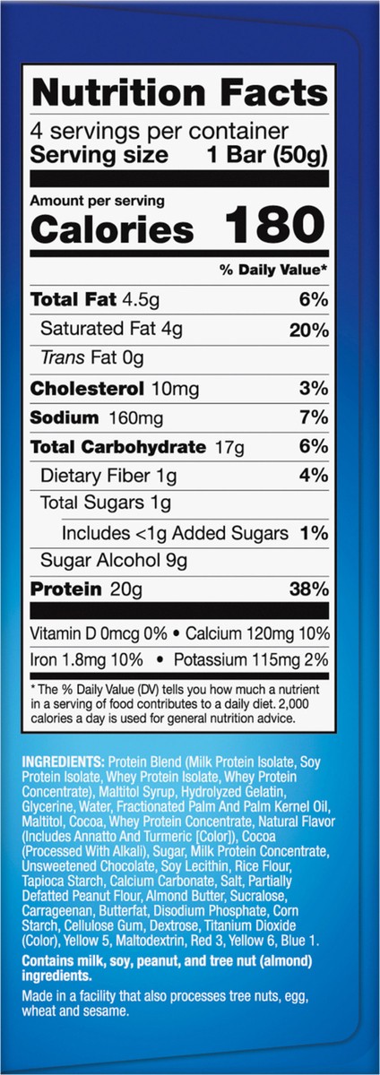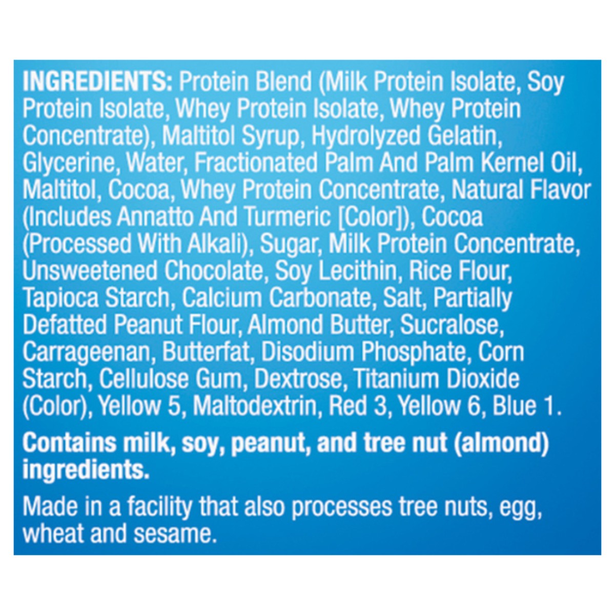 Protein Blend (Milk Protein Isolate, Soy Protein Isolate, Whey Protein Isolate, Whey Protein Concentrate), Maltitol Syrup, Hydrolyzed Gelatin, Glycerine, Water, Fractionated Palm and Palm Kernel Oil, …