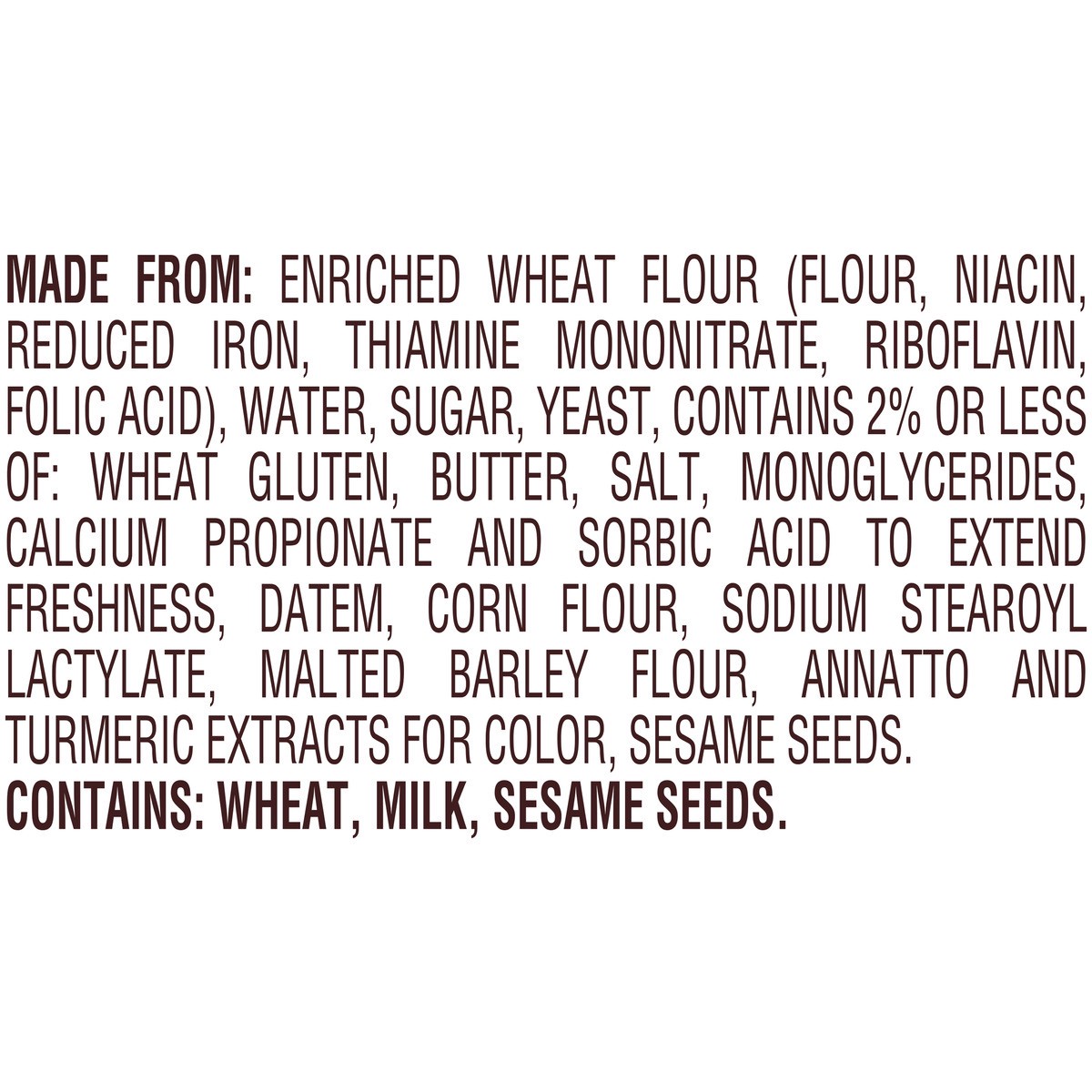 MADE FROM: ENRICHED WHEAT FLOUR (FLOUR, NIACIN, REDUCED IRON, THIAMINE MONONITRATE, RIBOFLAVIN, FOLIC ACID), WATER, SUGAR, YEAST, CONTAINS 2% OR LESS OF: WHEAT GLUTEN, BUTTER, SALT, MONOGLYCERIDES, CA…
