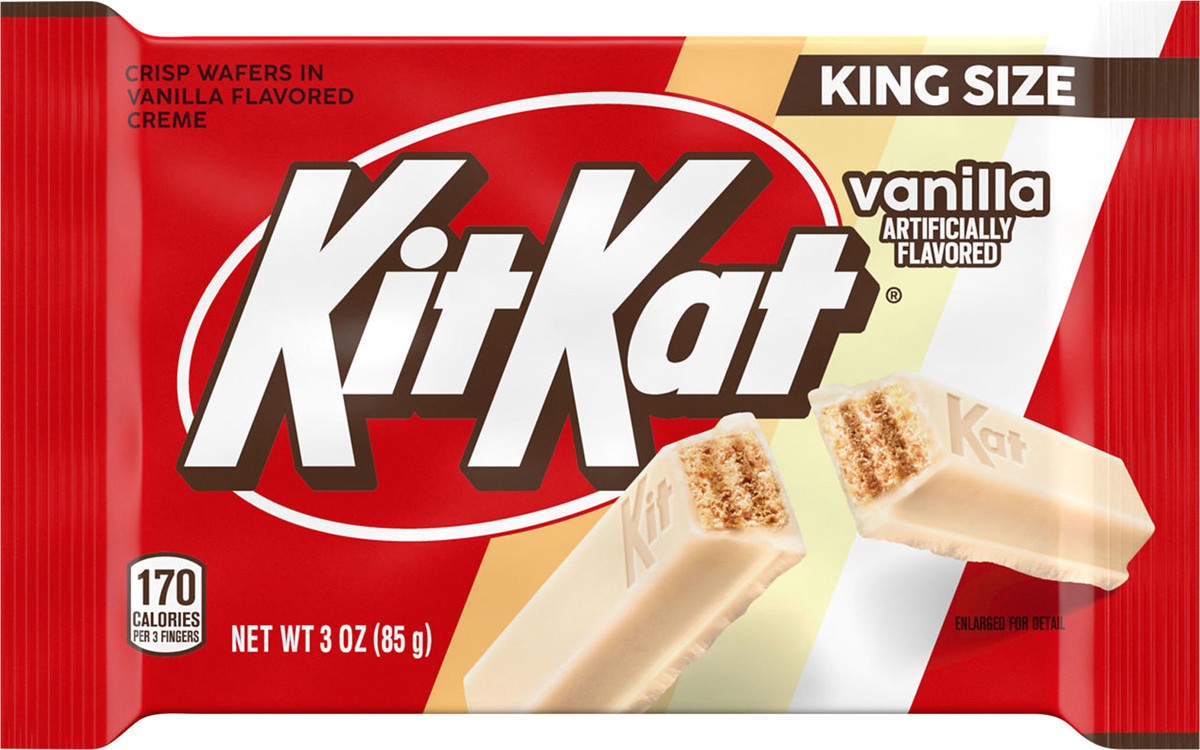 - Contains one (1) 3-ounce KIT KAT Vanilla Flavored Wafer King Size Candy BarIndulge in a sweet treat with KIT KAT wafer bars covered in vanilla flavored cremeKosher certified and enveloped in vanilla flavored creme