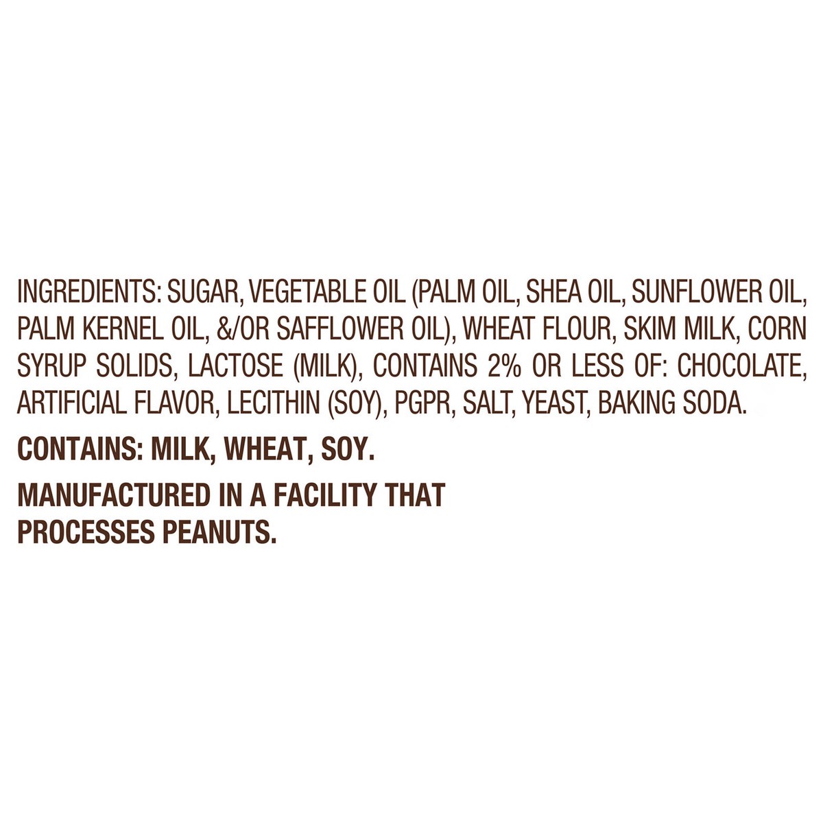 Sugar, Vegetable Oil (Palm Oil, Shea Oil, Sunflower Oil, Palm Kernel Oil, &/or Safflower Oil), Wheat Flour, Skim Milk, Corn Syrup Solids, Lactose (Milk), Contains 2% or Less of: Chocolate, Artificial …