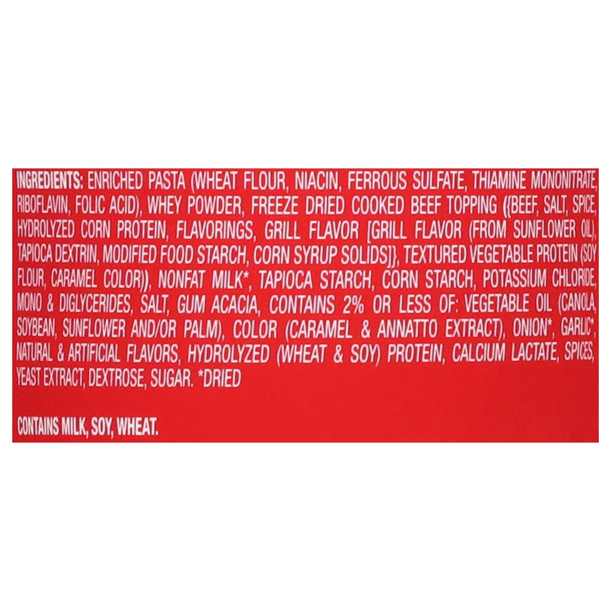 Enriched Pasta (Wheat Flour, Niacin, Ferrous Sulfate, Thiamine Mononitrate, Riboflavin, Folic Acid), Whey Powder, Freeze Dried Cooked Beef Topping ((Beef, Salt, Spice, Hydrolyzed Corn Protein, Flavoriā¦