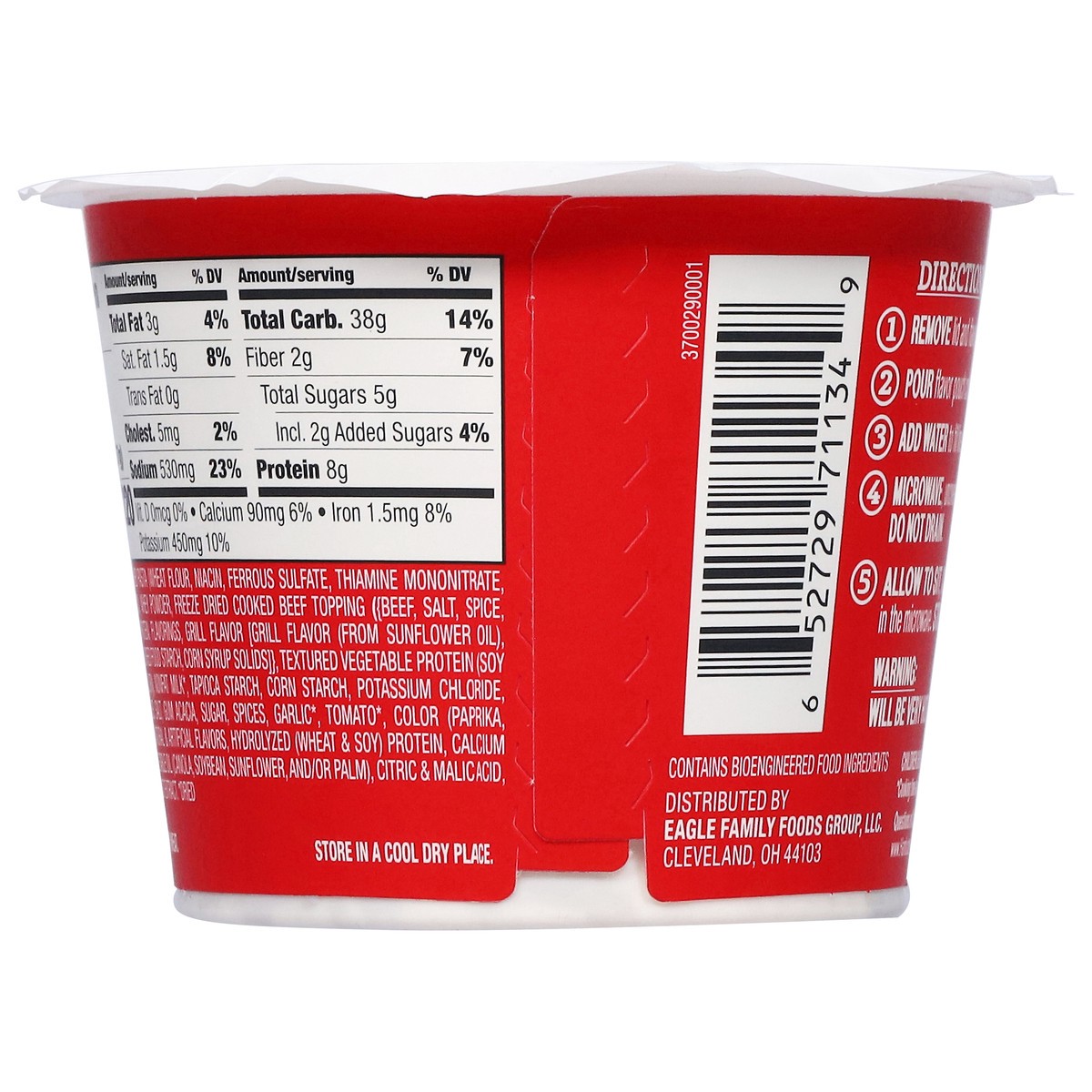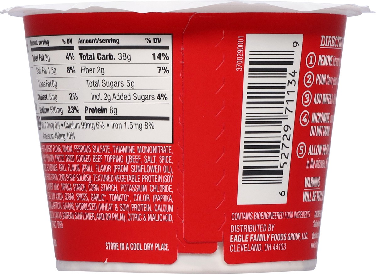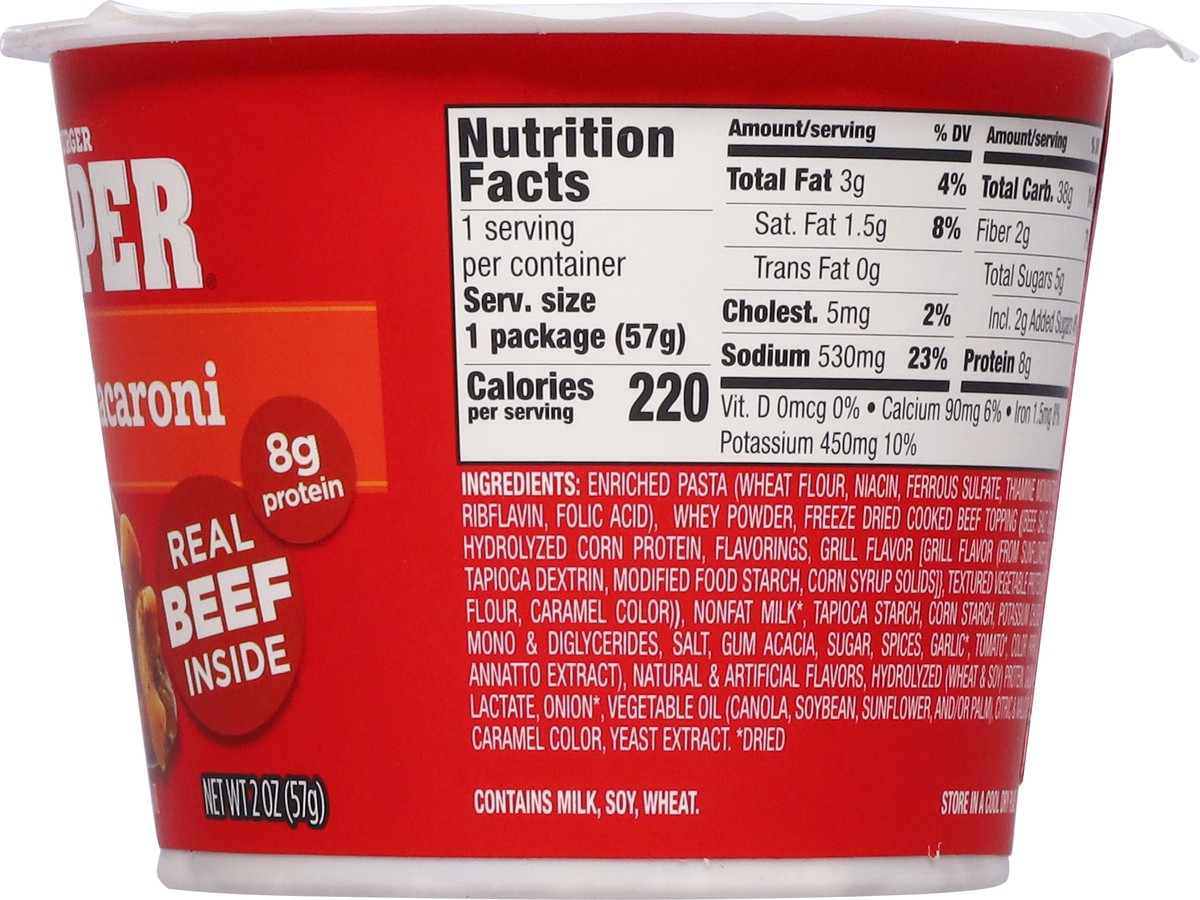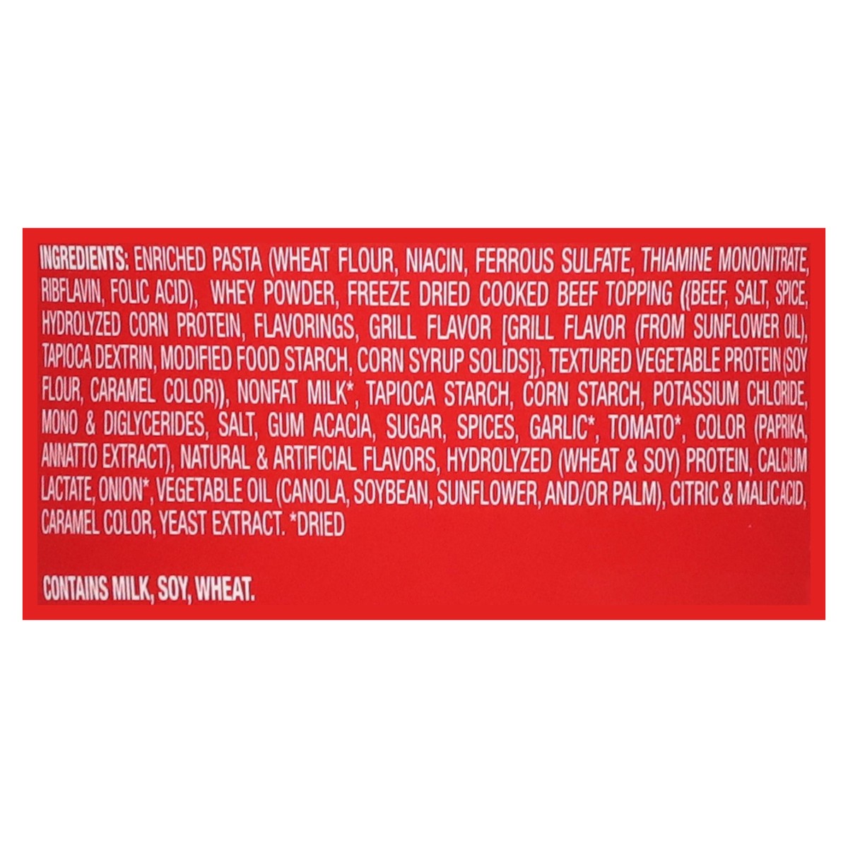 Enriched Pasta (Wheat Flour, Niacin, Ferrous Sulfate, Thiamine Mononitrate, Riboflavin, Folic Acid), Whey Powder, Freeze Dried Cooked Beef Topping (Beef, Salt, Spice, Hydrolyzed Corn Protein, Flavorin…