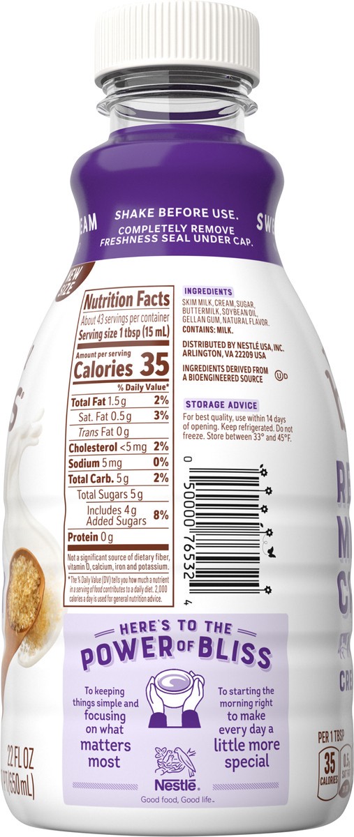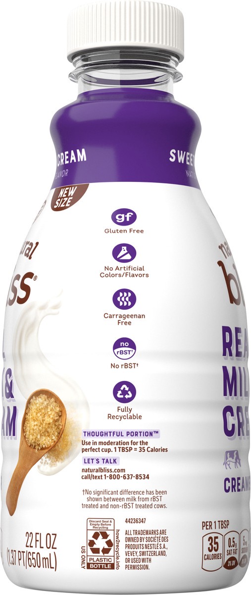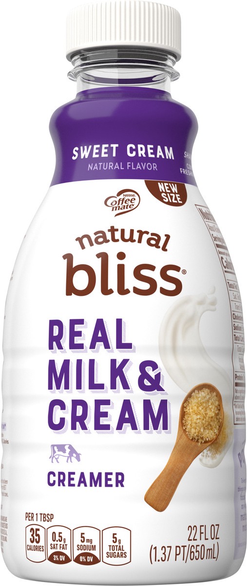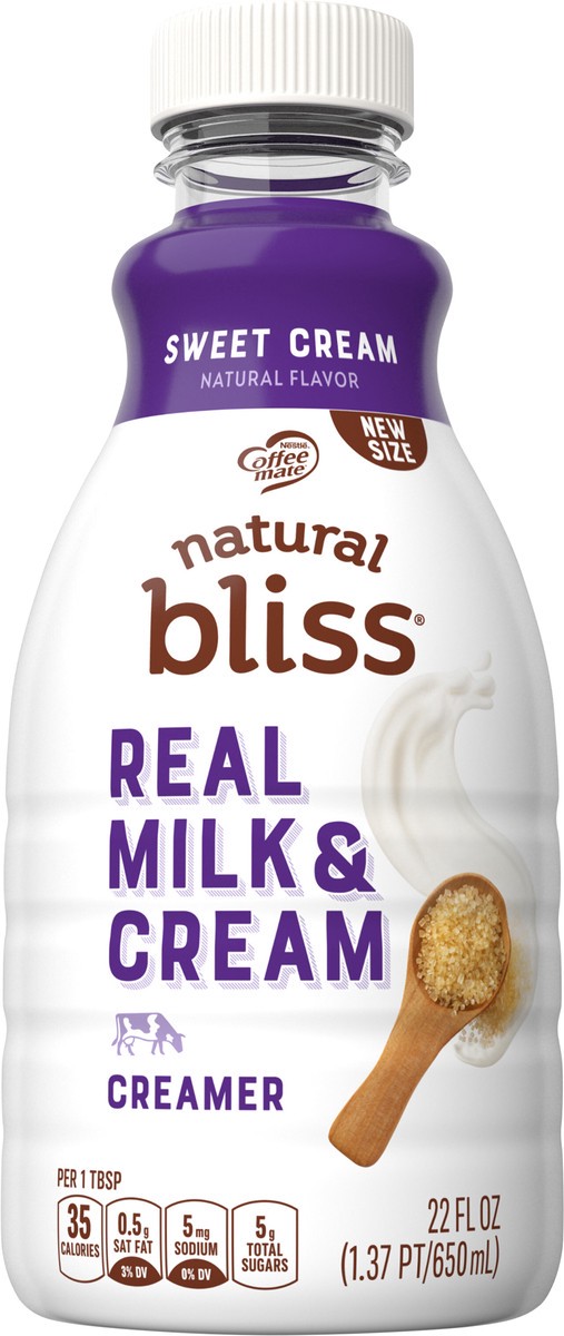 - One 22 fl oz Bottle of Liquid Natural Bliss Real Milk & Cream Sweet Cream Flavored Coffee Creamer.