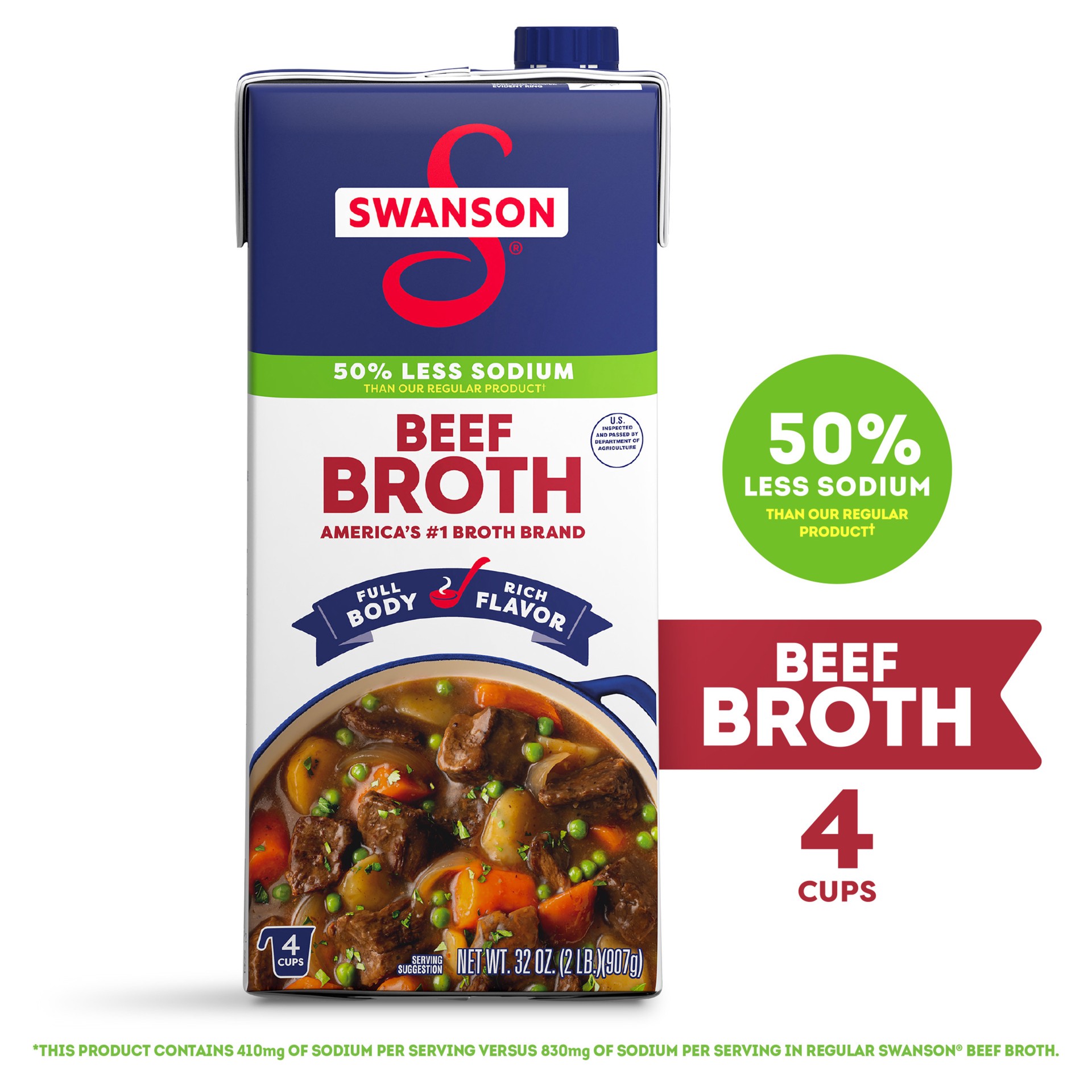 - 50% less sodium than regular Swanson Beef Broth*. (*410 mg of sodium per serving versus 830 mg of sodium per serving in regular Swanson Beef Broth)