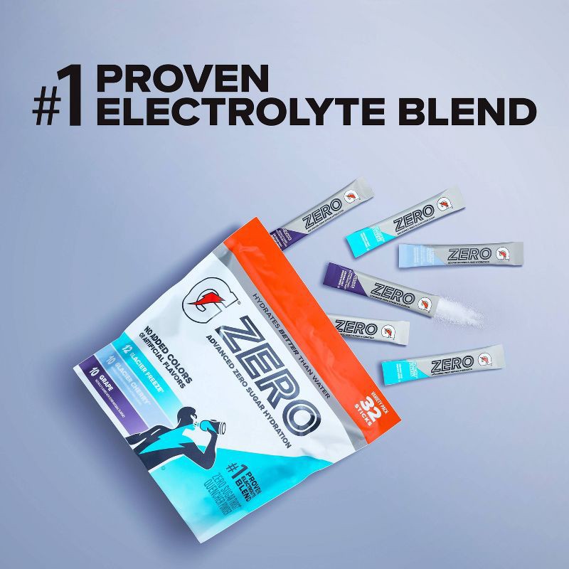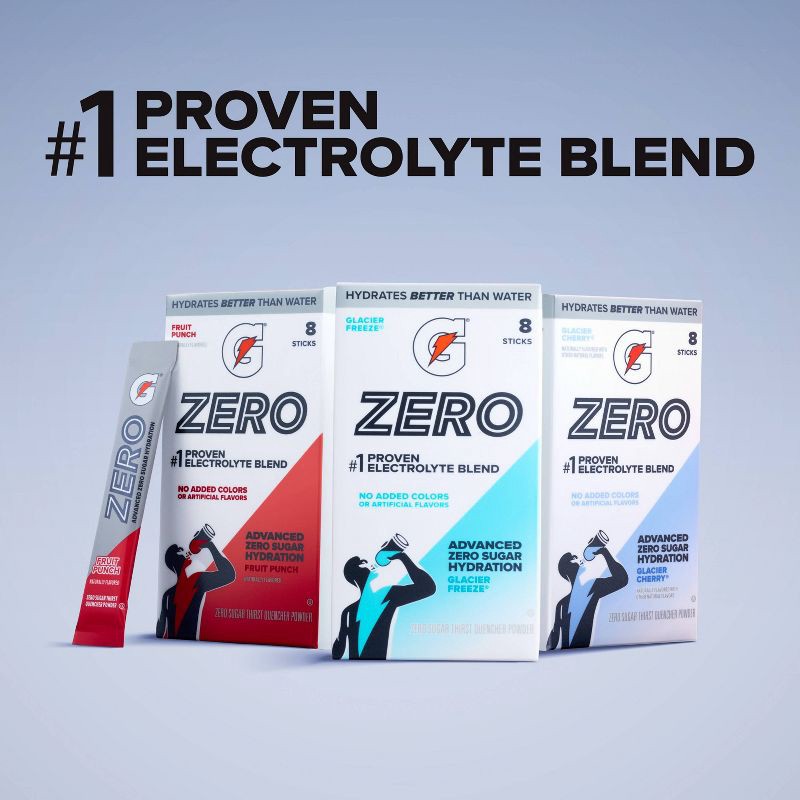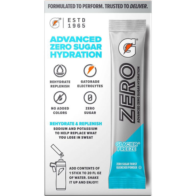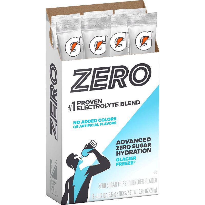 - Includes 8 powder sticks of Gatorade Zero Sugar Electrolyte Drink Mix, Glacier Freeze.