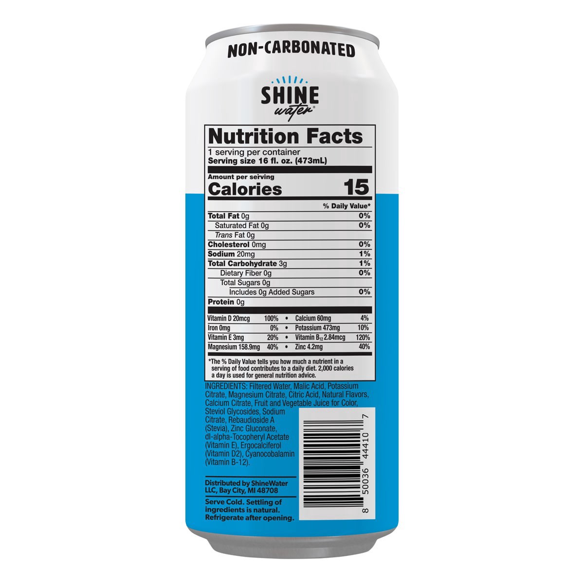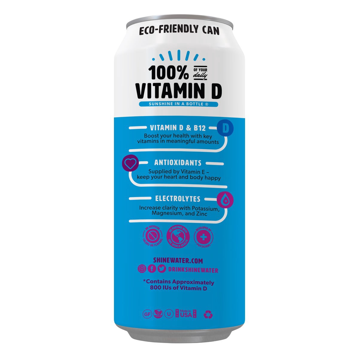 ShineWater offers 100% of your daily Vitamin D. ShineWater is naturally sweetened with zero added sugar ShineWater has key electrolytes including Potassium, Magnesium, and Zinc ShineWater is all natur…
