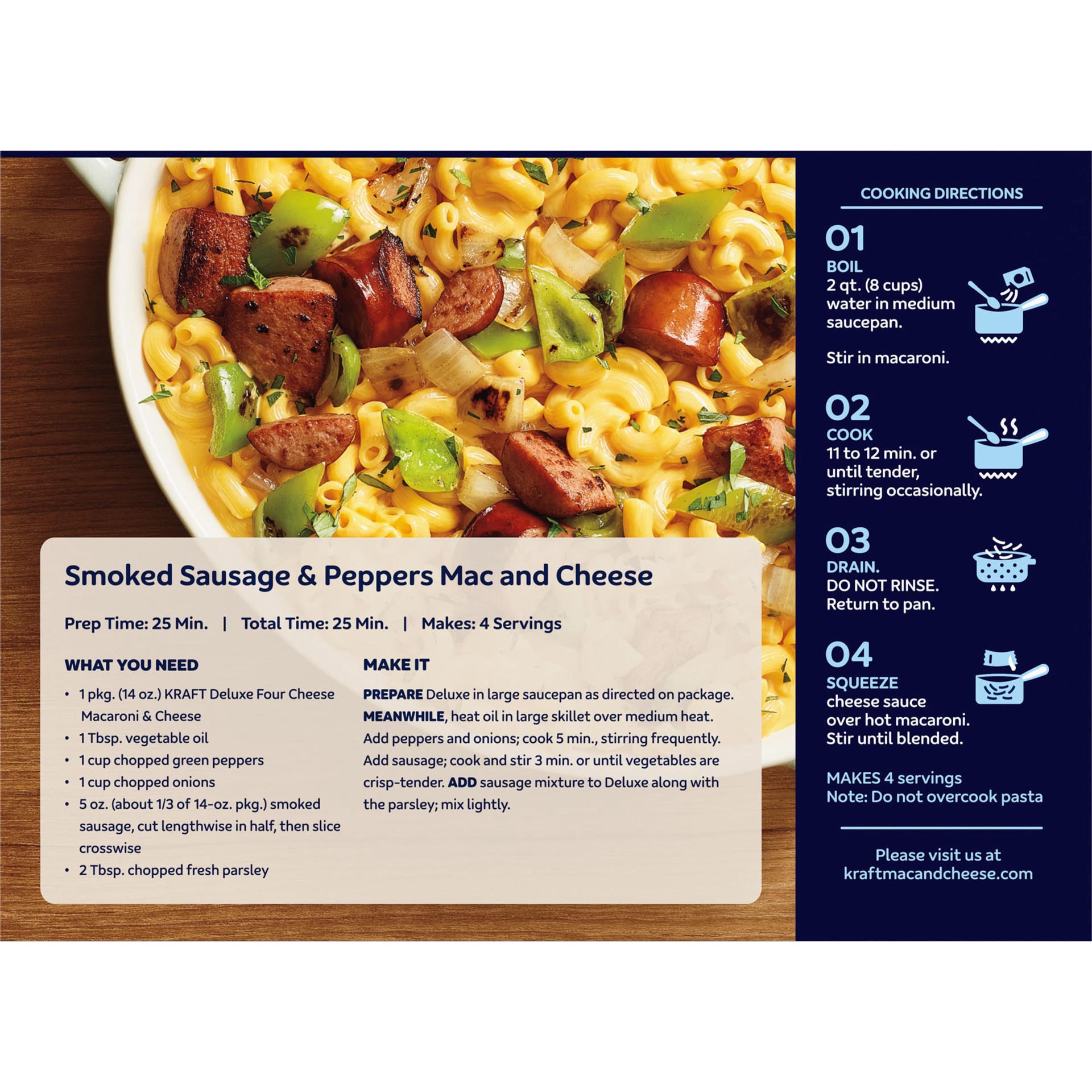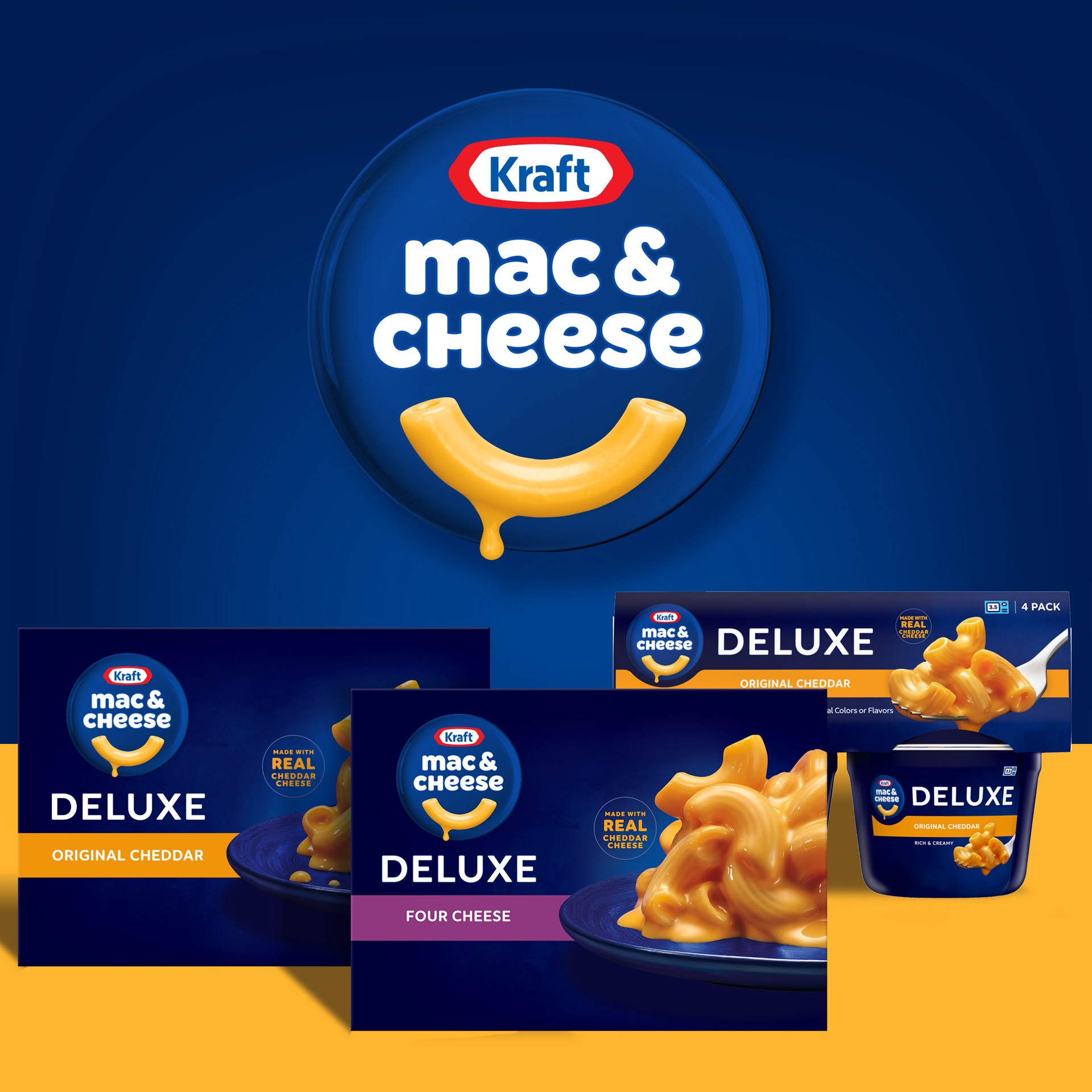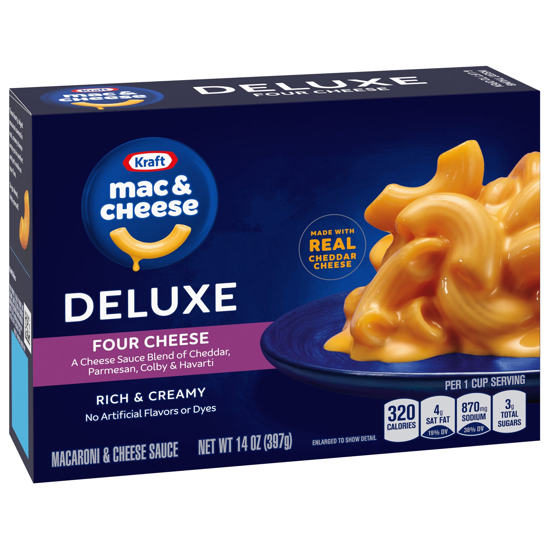 Help yourself to a bowl of comfort with Kraft Deluxe Four Cheese Macaroni & Cheese Dinner. Rich and creamy, our dinner is made with ridge macaroni and real cheese sauce with a colby, Parmesan, cheddar…