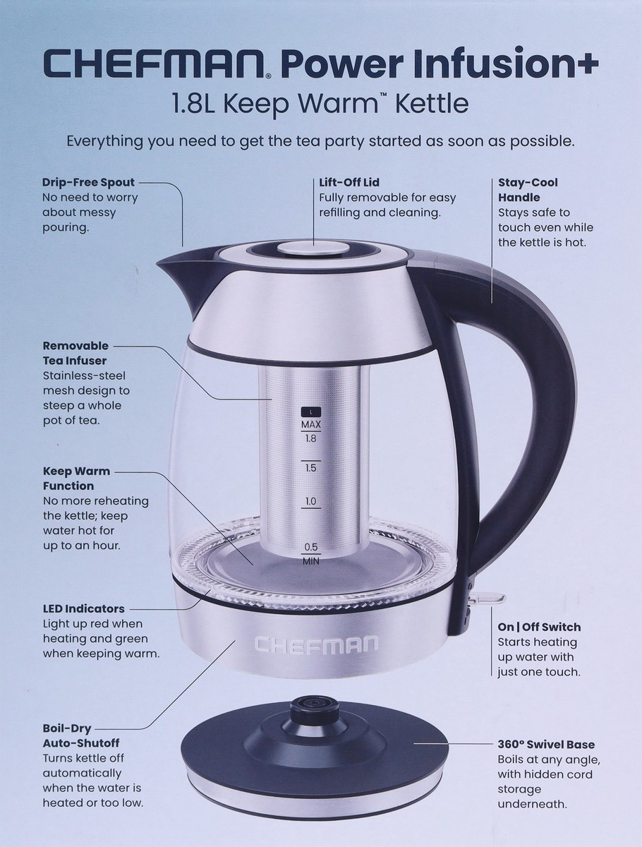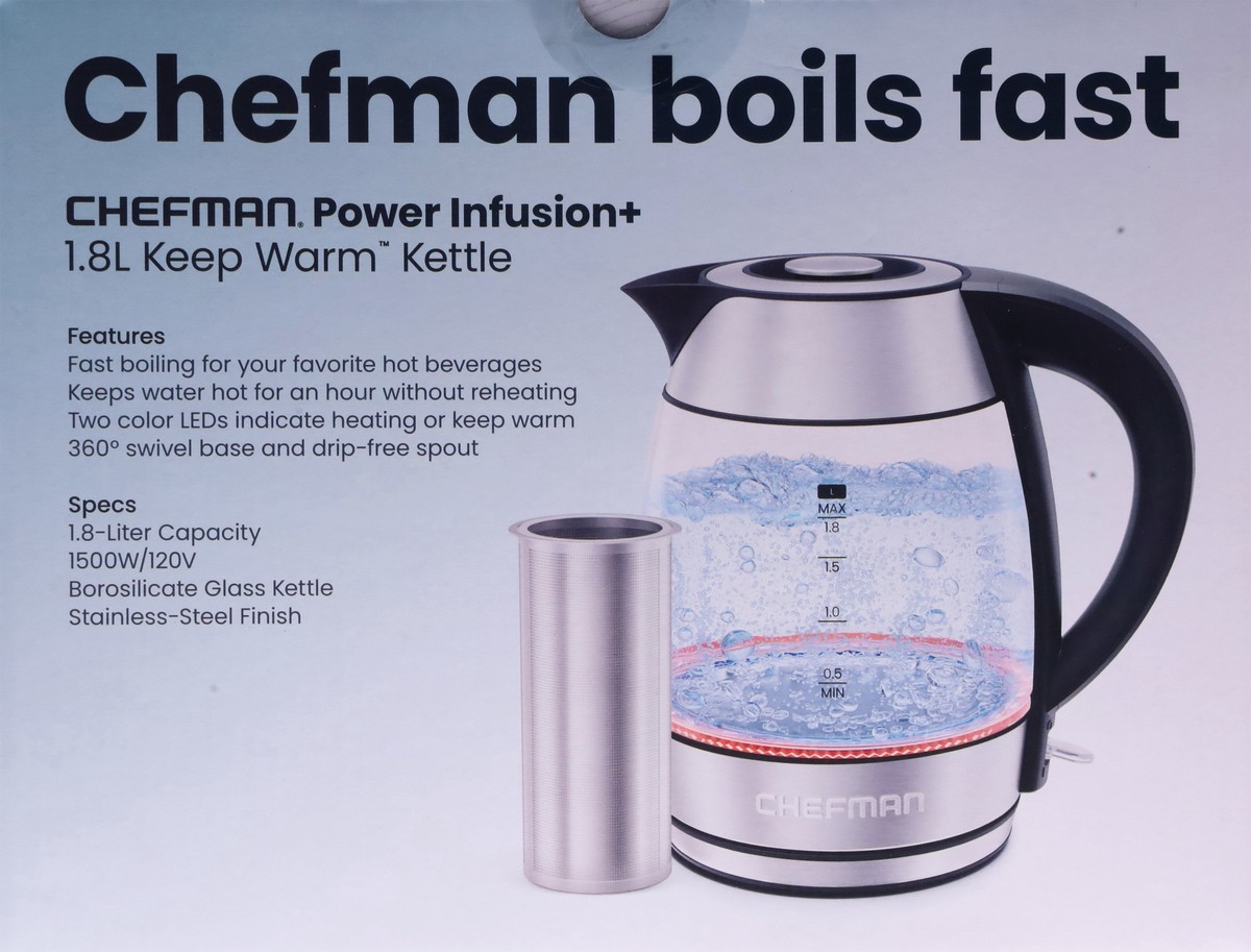 The Chefman Power Infusion Plus™ 1.8-Liter Electric Kettle heats water fast for hot beverages, coffee, soup, ramen, oatmeal, and more! Red and green LED lights illuminate to indicate heating and keep …