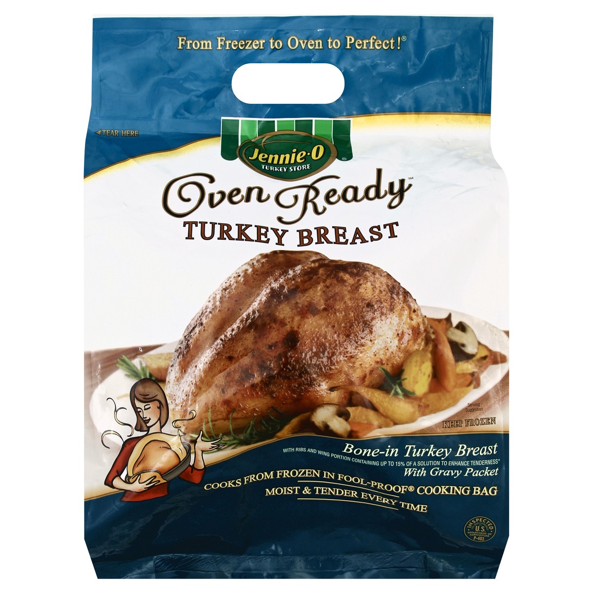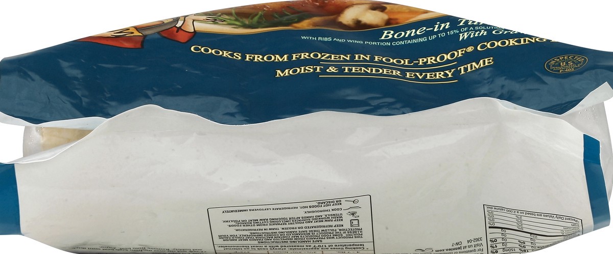 Bone-in turkey breast. With ribs and wing portion containing up to 15% of a solution to enhance tenderness (Solution Ingredients: water, sodium phosphate, salt, sugar). With gravy packet. From freezer…