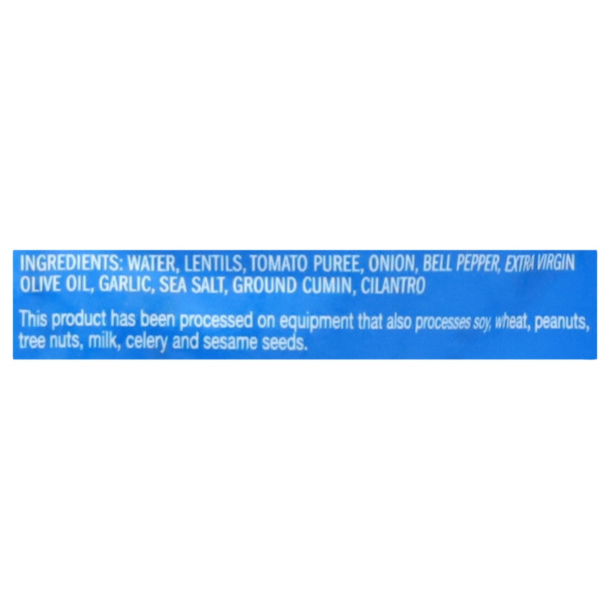 Water, Lentils, Tomatoes, Onion, Bell Peppers, Olive Oil, Sea Salt, Garlic, Ground Cumin, Ground Annatto Seeds, Natural Cilantro Flavor.