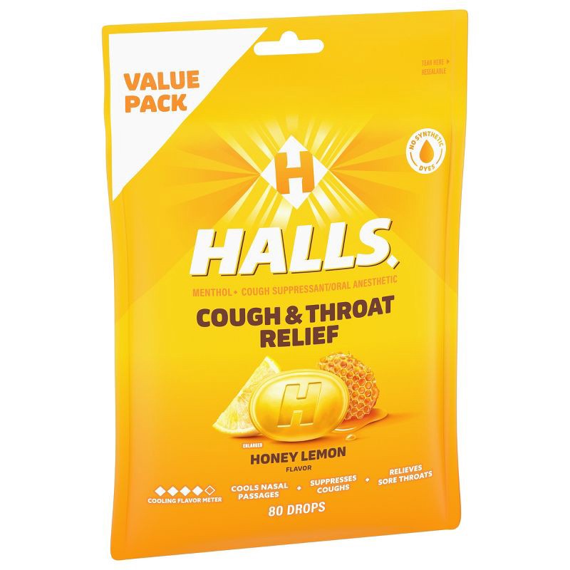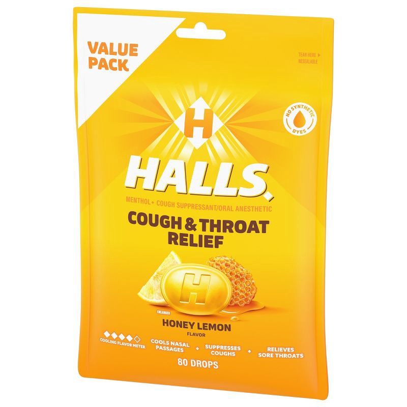 - One value pack bag of 80 HALLS Cough and Throat Relief Honey Lemon Cough Drops (packaging may vary)