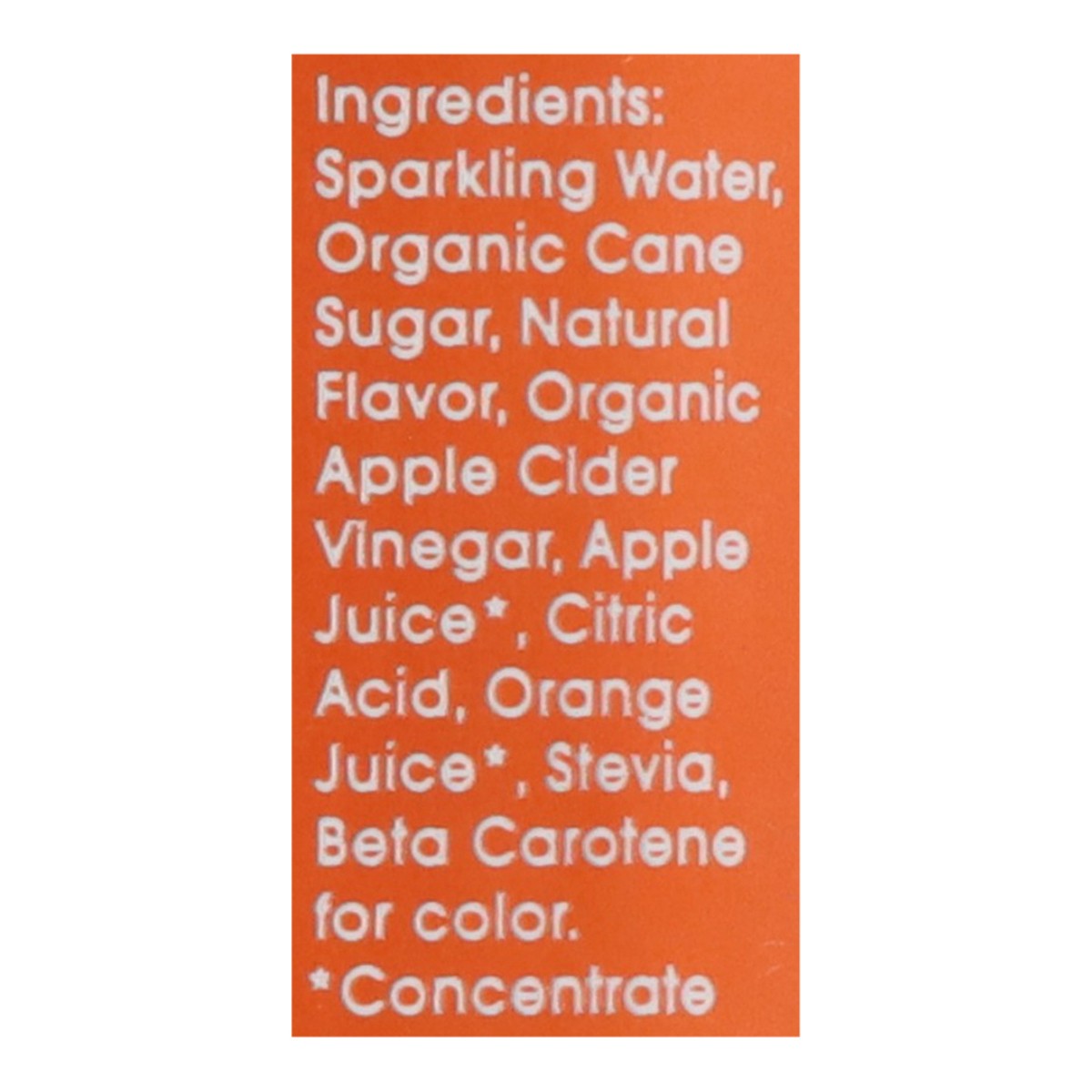 Sparkling Water, Organic Cane Sugar, Natural Flavor, Organic Apple Cider Vinegar, Organic Agave Inulin, Apple Juice (Concentrate), Citric Acid, Orange Juice (Concentrate), Stevia, Beta Carotene for Co…