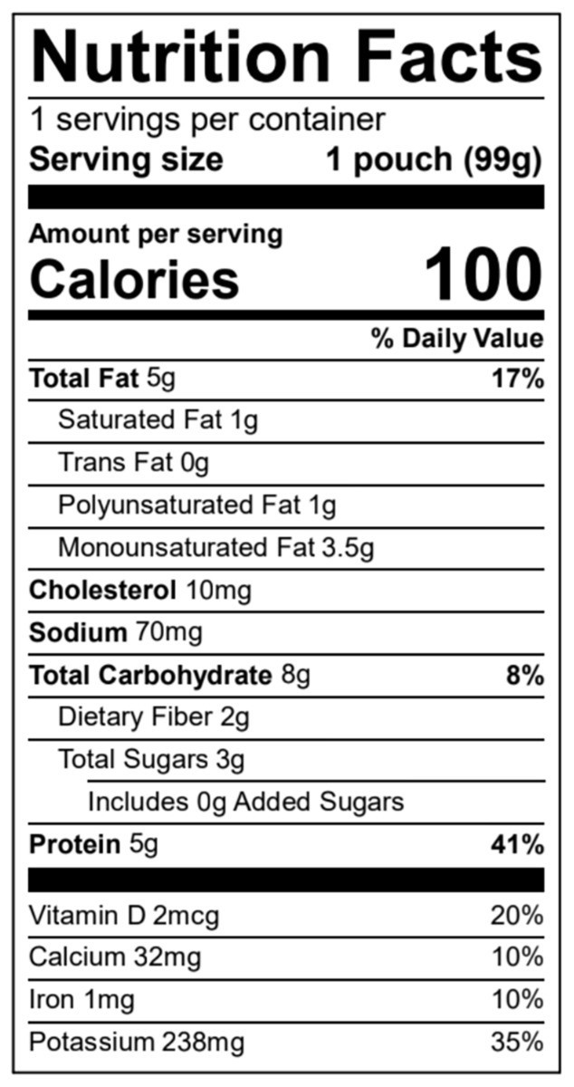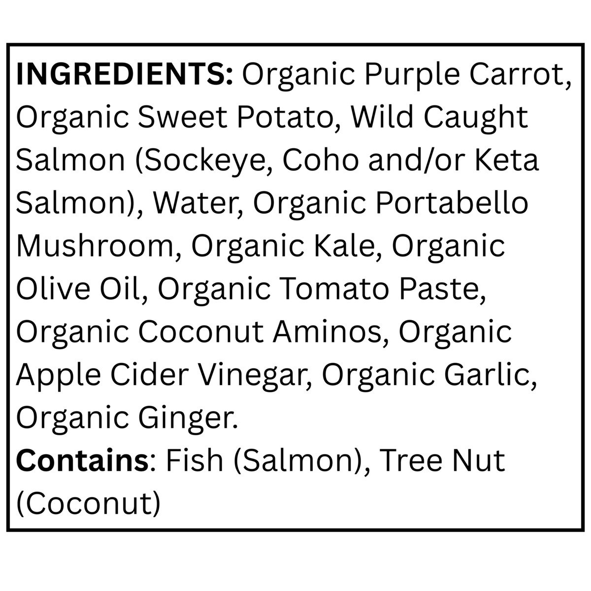 Organic Purple Carrot, Organic Sweet Potato, Wild Caught Salmon (Sockeye, Coho and/or Keta Salmon), Water, Organic Portabello Mushroom, Organic Kale, Organic Olive Oil, Organic Tomato Paste, Organic C…