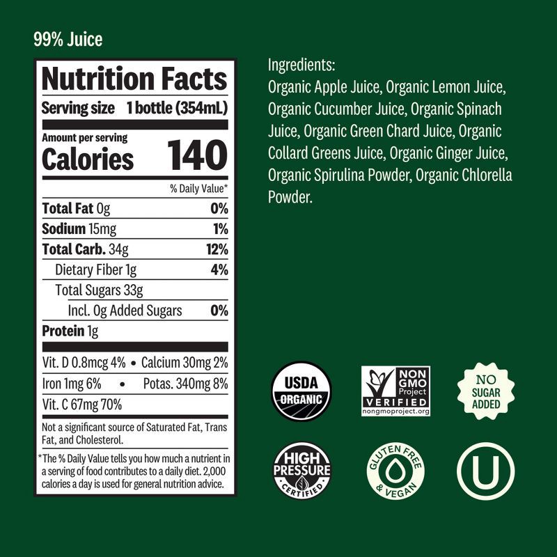 - NUTRIENT BOOST: With nutrient-rich superfoods, like organic apple juice, lemon, cucumber, spinach, chard, collard greens, spirulina and chlorella