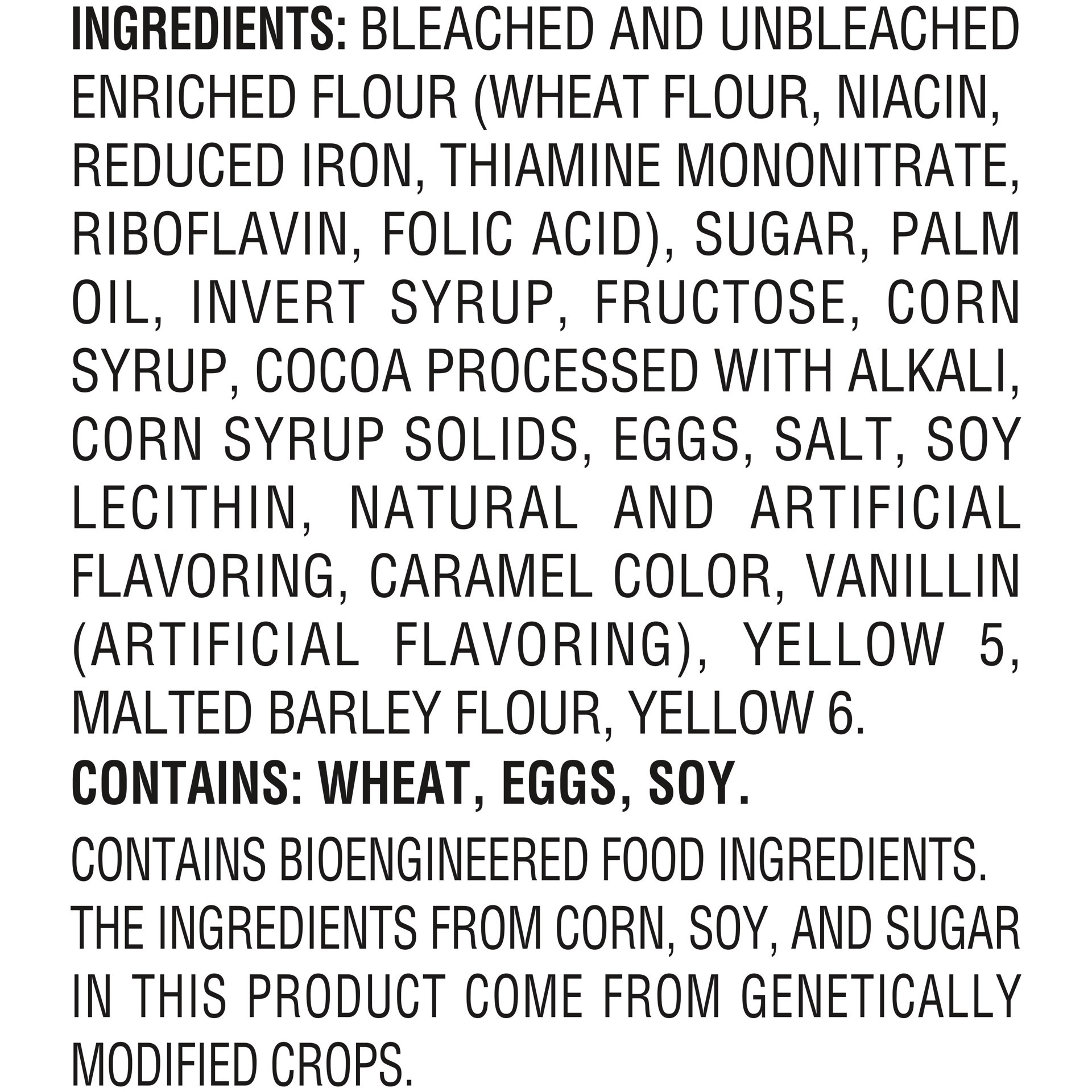 INGREDIENTS: BLEACHED AND UNBLEACHED ENRICHED FLOUR (WHEAT FLOUR, NIACIN, REDUCED IRON, THIAMINE MONONITRATE, RIBOFLAVIN, FOLIC ACID), SUGAR, PALM OIL, INVERT SYRUP, FRUCTOSE, CORN SYRUP, COCOA PROCES…