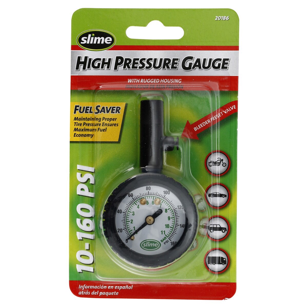 High pressure dial gauge has rugged housing for maximized grip. Make reading your tire pressure easy by using its built in reset and bleeder valve.