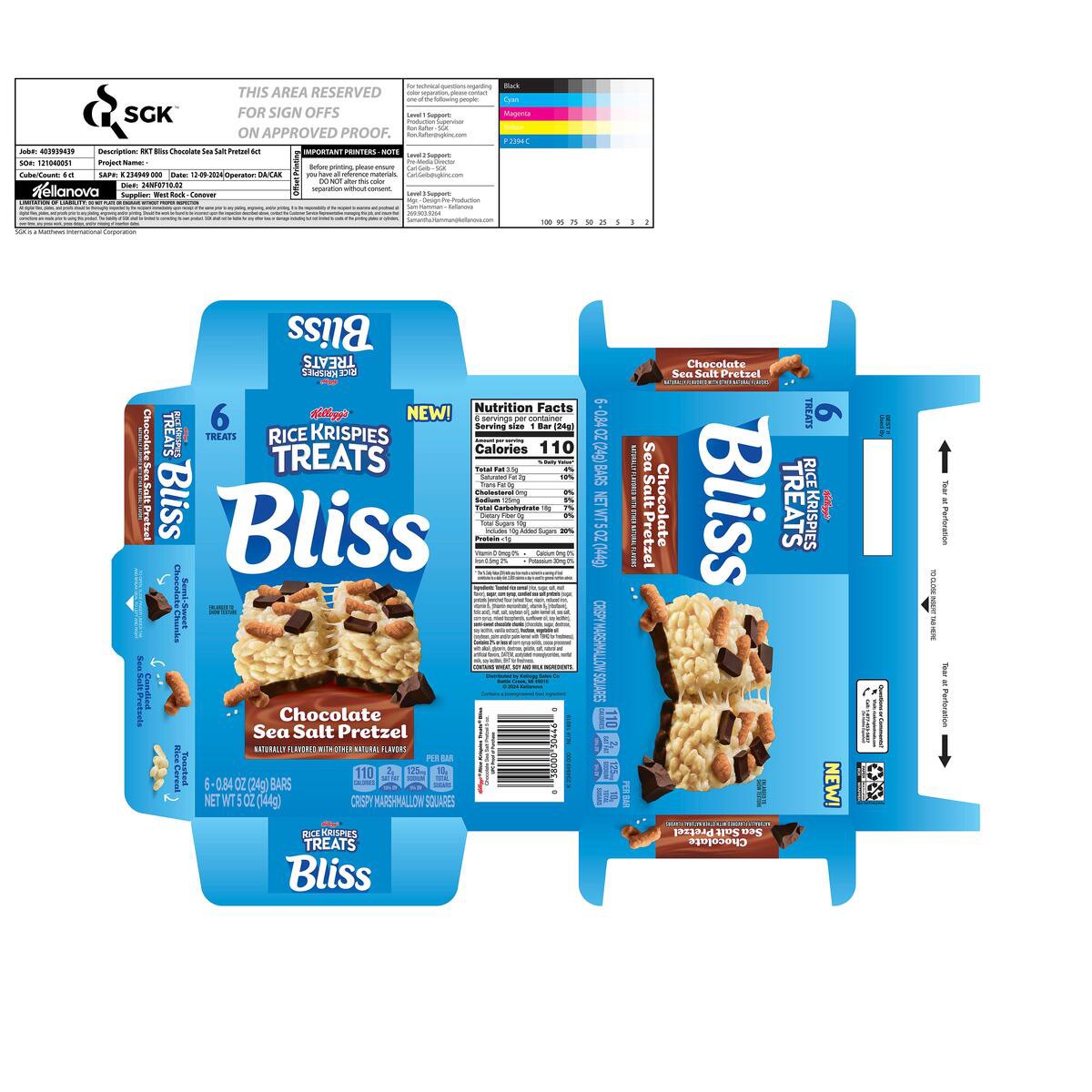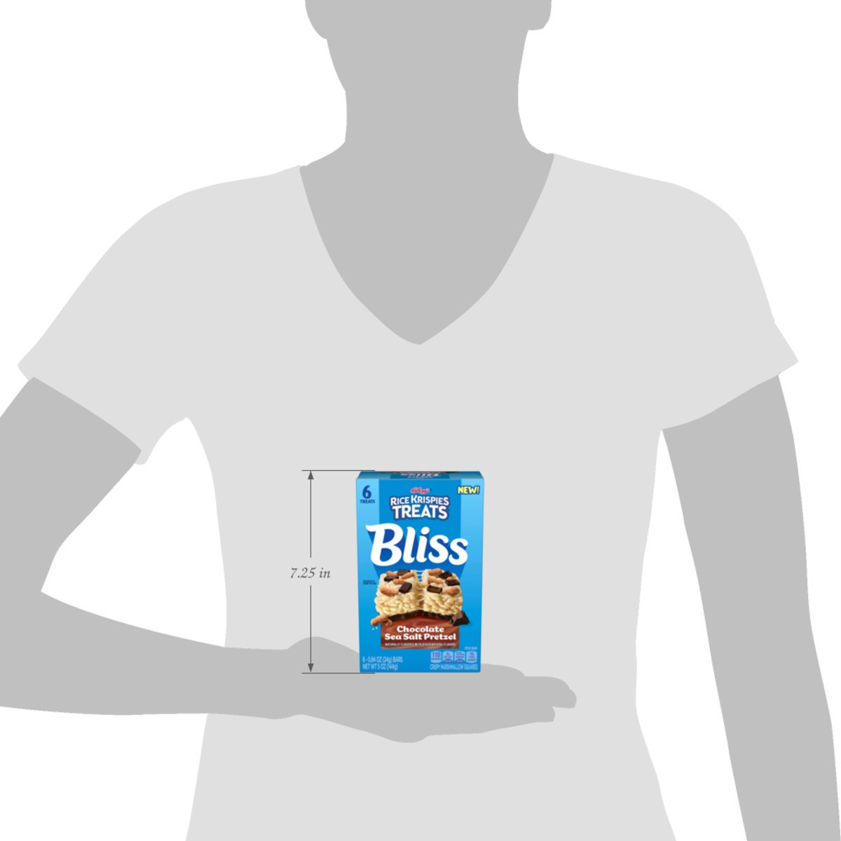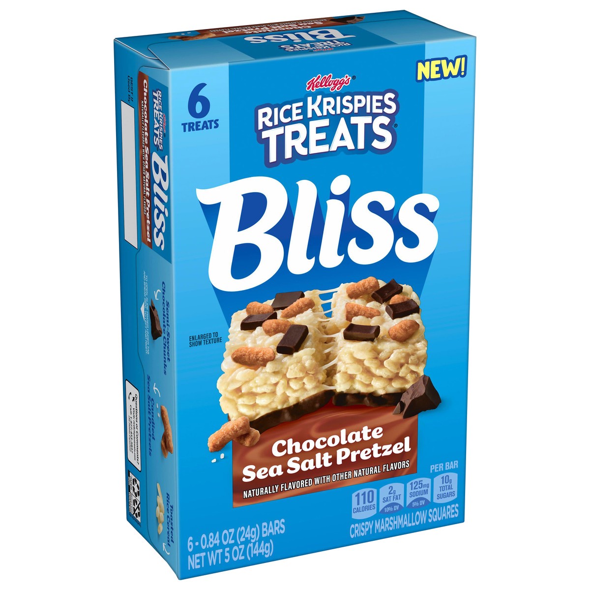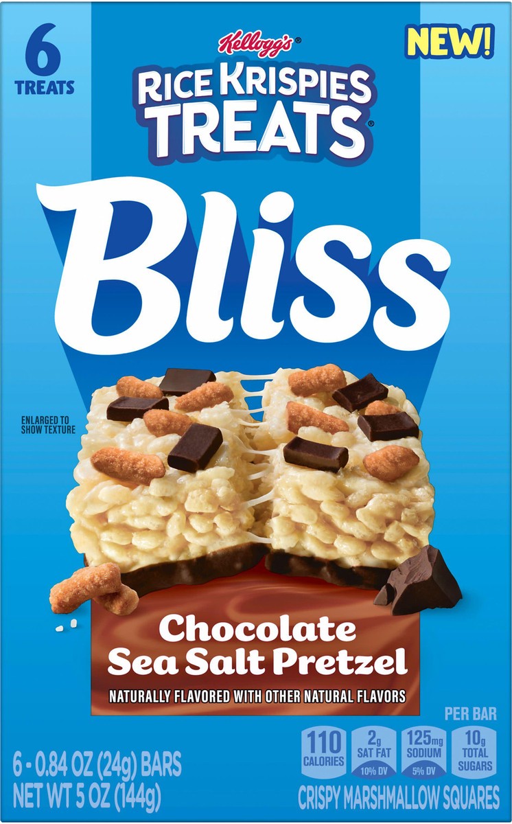 - 5oz box containing 6 Rice Krispies Treats Bliss Chocolate Sea Salt Pretzel crispy marshmallow squares