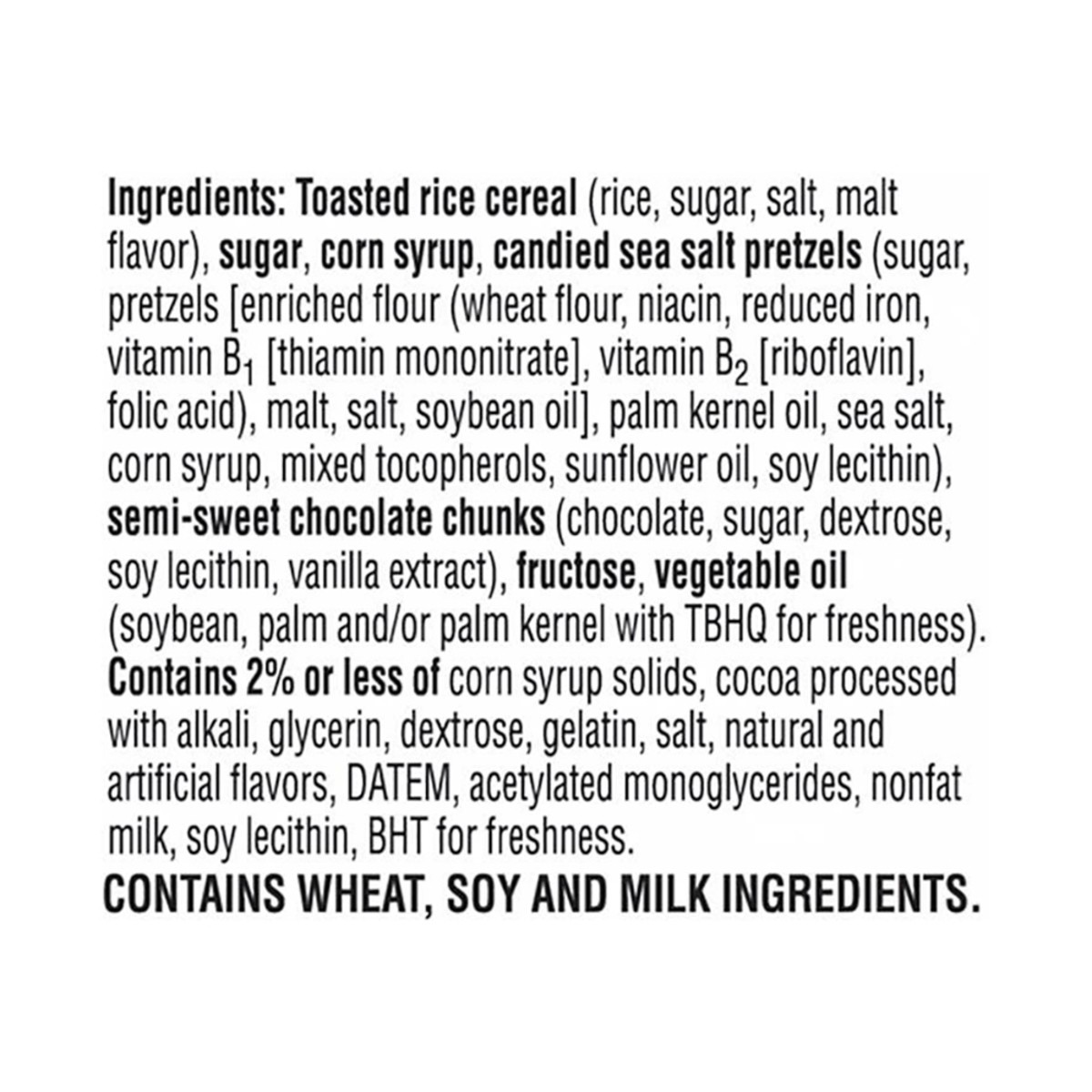 Toasted Rice Cereal (Rice, Sugar, Salt, Malt Flavor), Sugar, Corn Syrup, Candied Sea Salt Pretzels (Sugar, Pretzels [Enriched Flour (Wheat Flour, Niacin, Reduced Iron, Vitamin B [Thiamin Mononitrate],…