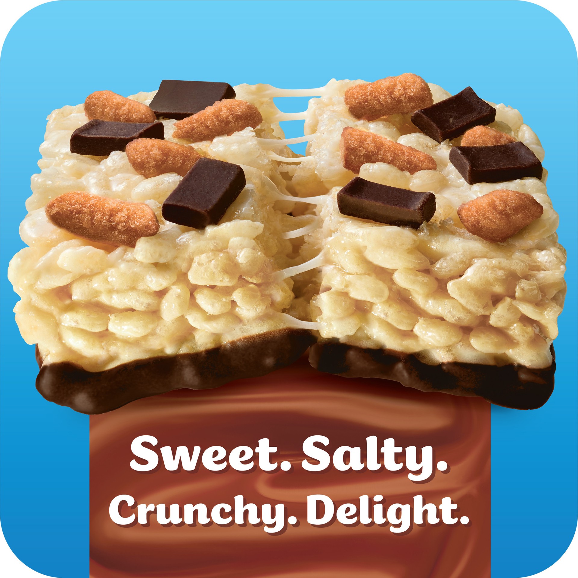 Take a bite of sweet, salty, crispy perfection. Enjoy timeless Rice Krispies Treats snacks now topped with candied sea salt pretzels, semi-sweet chocolate chunks, and layered on the bottom with smooth…