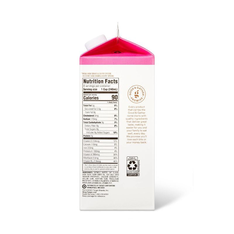 OATMILK (WATER, OAT FLOUR), VEGETABLE OIL (SUNFLOWER AND/OR CANOLA AND/OR PALM OIL), SEA SALT, DIPOTASSIUM PHOSPHATE, CALCIUM CARBONATE, GELLAN GUM, TRICALCIUM PHOSPHATE, VITAMIN A PALMITATE, VITAMIN …