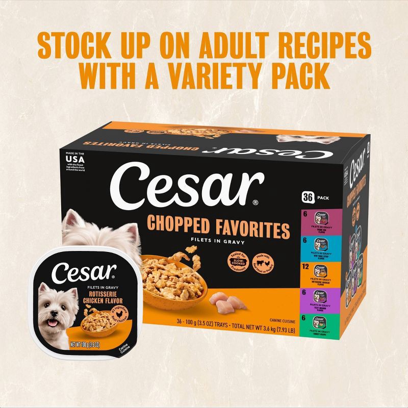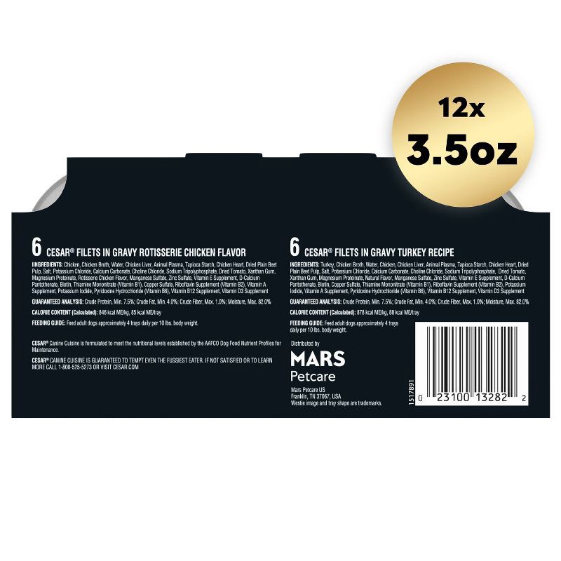 - 12-Pack: Contains twelve (12) 3.5 oz. trays of Cesar Filets in Gravy Adult Wet Dog Food Poultry Lovers: (6) Rotisserie Chicken Flavor, and (6) Turkey Recipe.