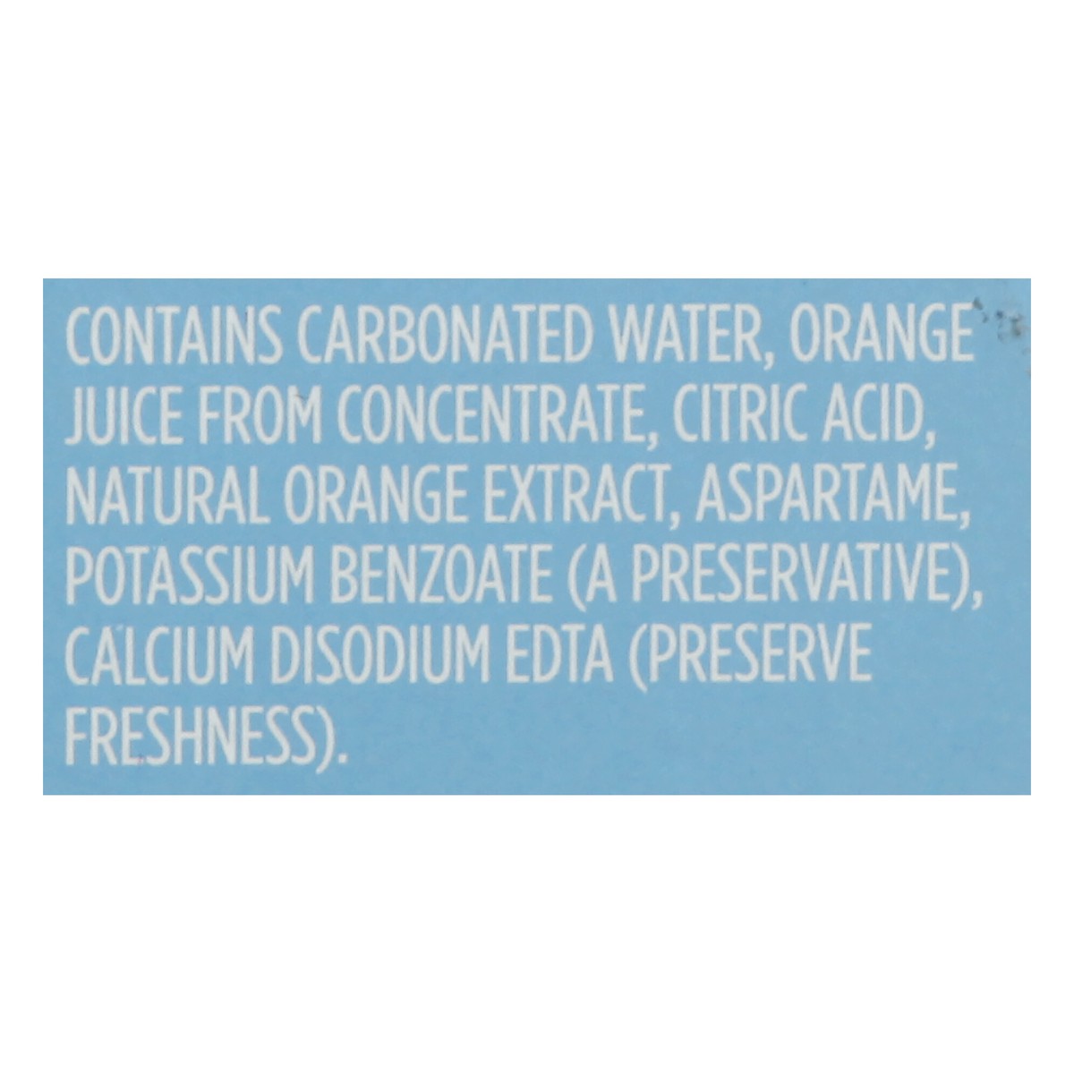 Contains Carbonated Water, Orange Juice from Concentrate, Citric Acid, Natural Orange Extract, Aspartame, Potassium Benzoate (a Preservative), Calcium Disodium EDTA (Preserve Freshness).