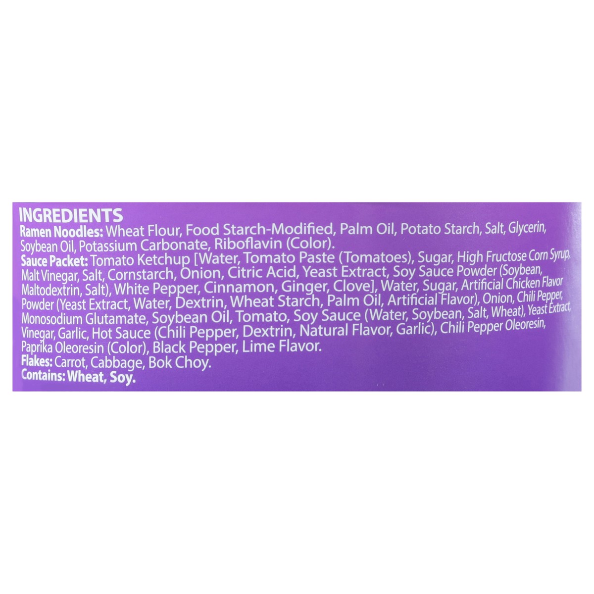 Ramen Noodles: Wheat Flour, Food Starch-Modified, Palm Oil, Potato Starch, Salt, Glycerin, Soybean Oil, Potassium Carbonate, Riboflavin (Color). Sauce Packet: Tomato Ketchup [Water, Tomato Paste (Toma…