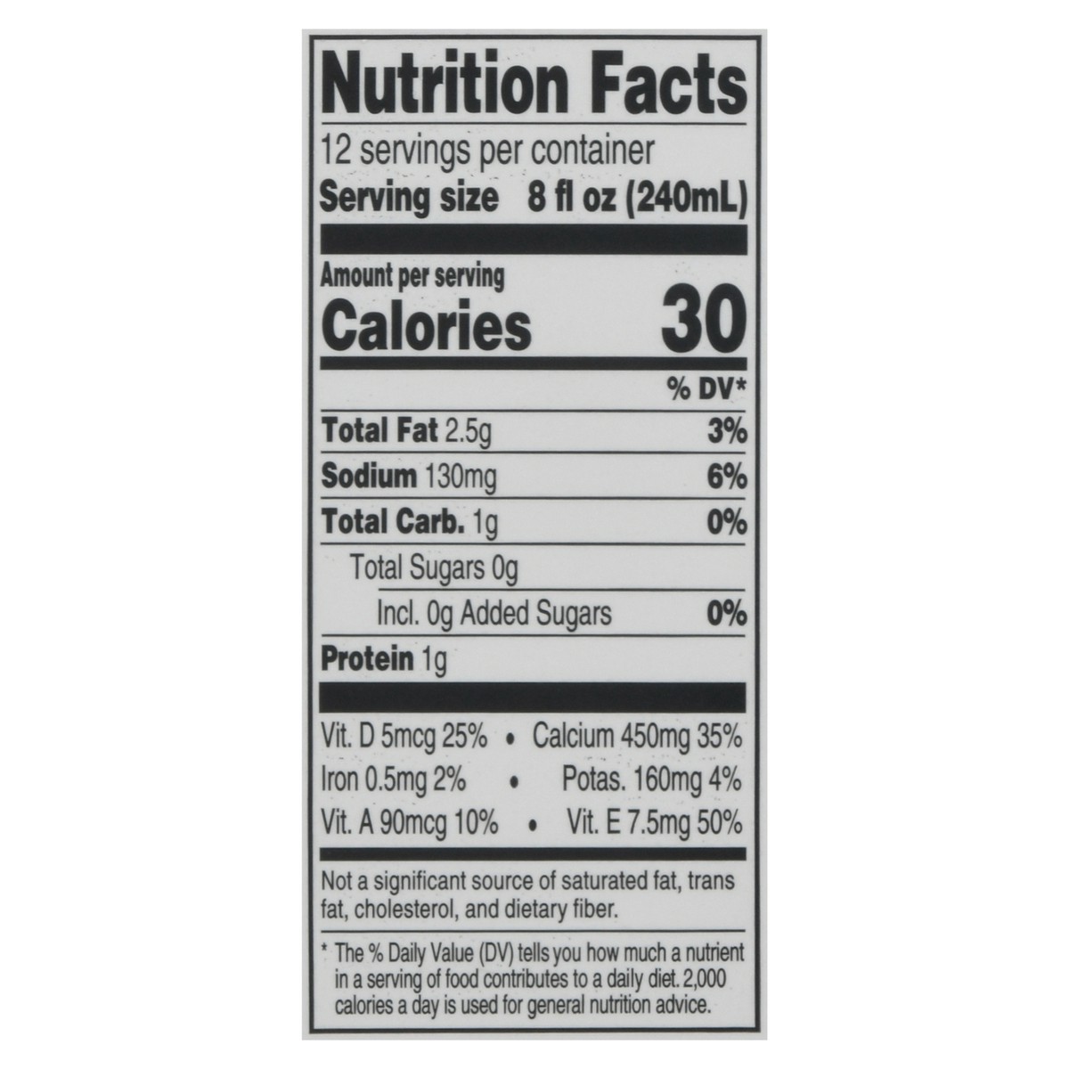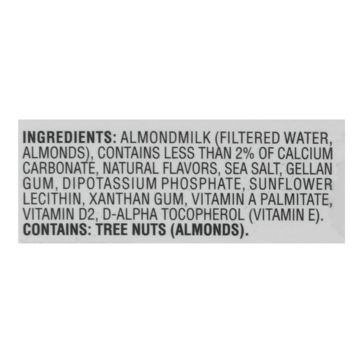 Almondmilk (Filtered Water, Almonds), Contains Less than 2% of Calcium Carbonate, Natural Flavors, Sea Salt, Gellan Gum, Dipotassium Phosphate, Sunflower Lecithin, Xanthan Gum, Vitamin A Palmitate, Vi…