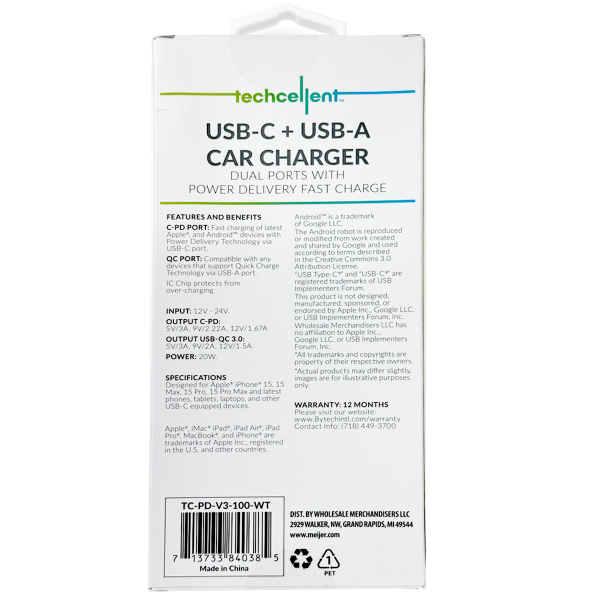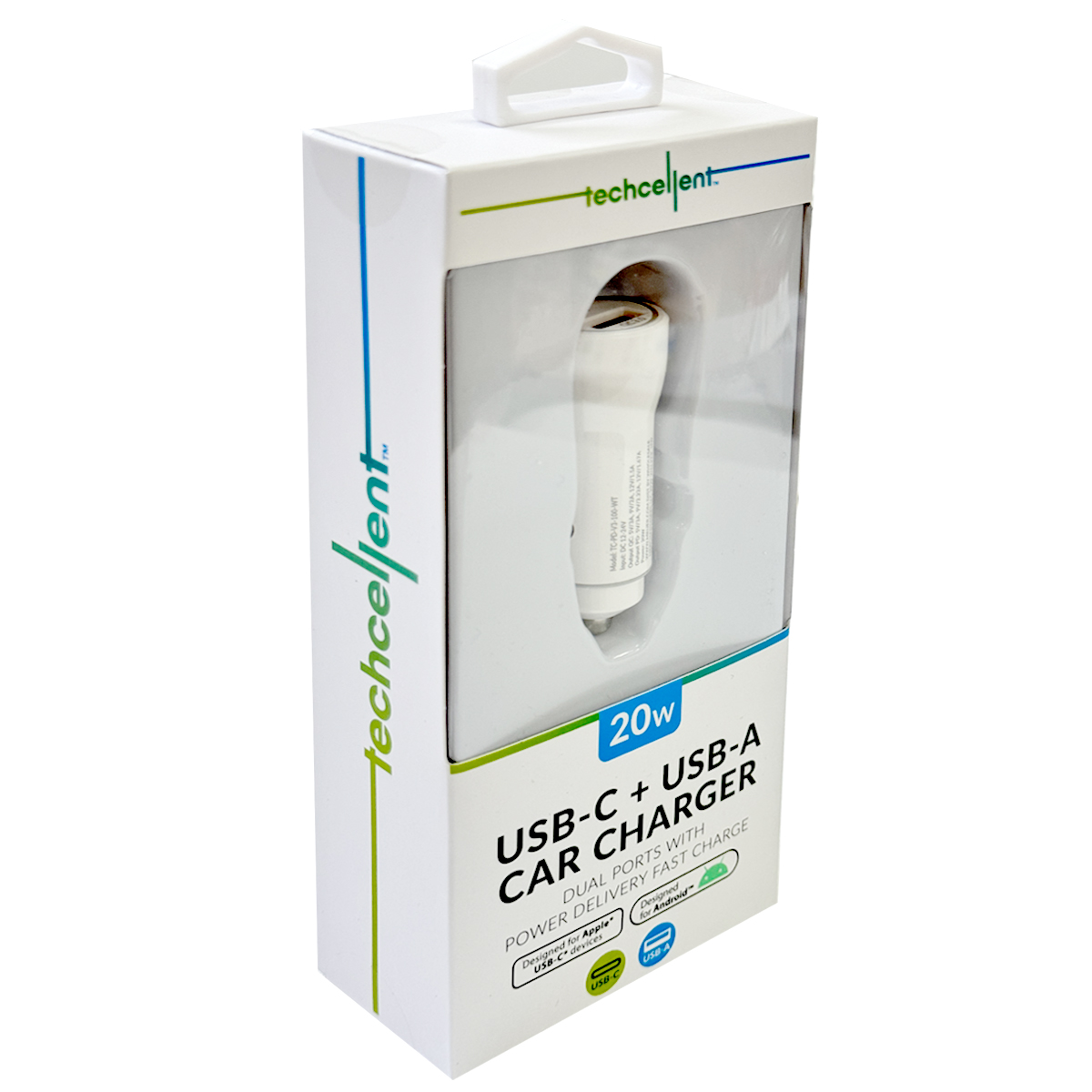 Techcellent 20W 1 Type-C & 1 USB-A Port Power Delivery Quick Charge Car Charger, White