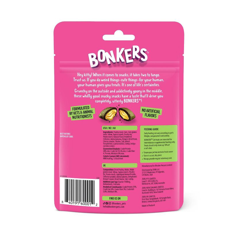 BONKERS Catnip, Chick 'N' Cheddar flavor cat treats have a crunchy outer layer and irresistibly gooey center, delivering a texture and taste combination that even the pickiest of cats will go Bonkers …