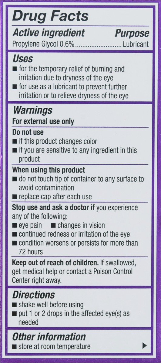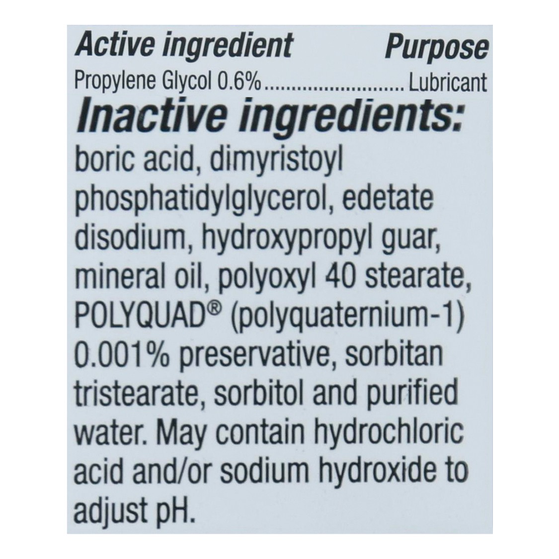 Active Ingredients: Propylene Glycol (0.6 %), Lubricant. Inactive Ingredients: Boric Acid, Dimyristoyl Phosphatidylglycerol, Edetate Disodium, Hydroxypropyl Guar, Mineral Oil, Polyoxyl 40 Stearate , P…