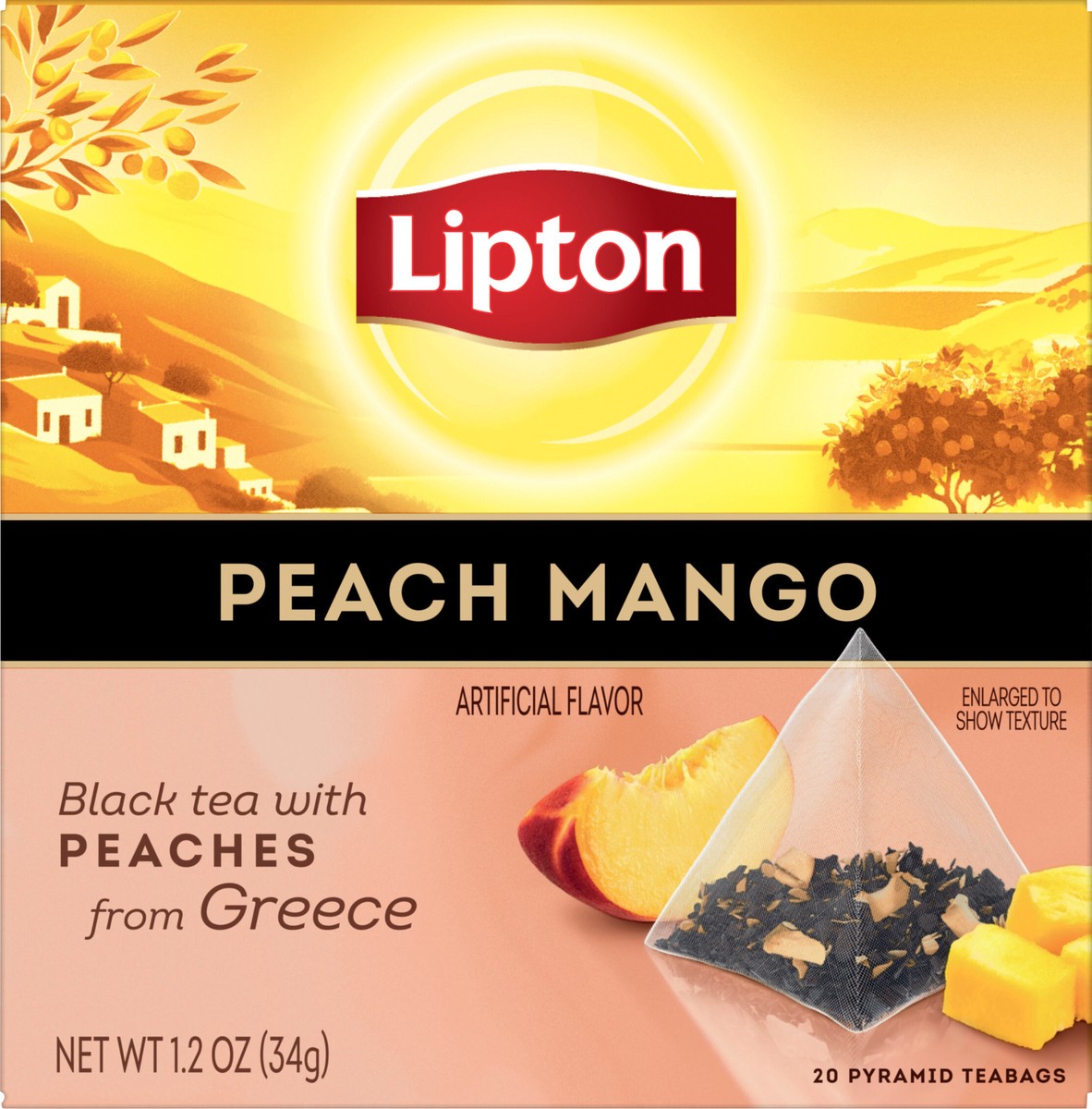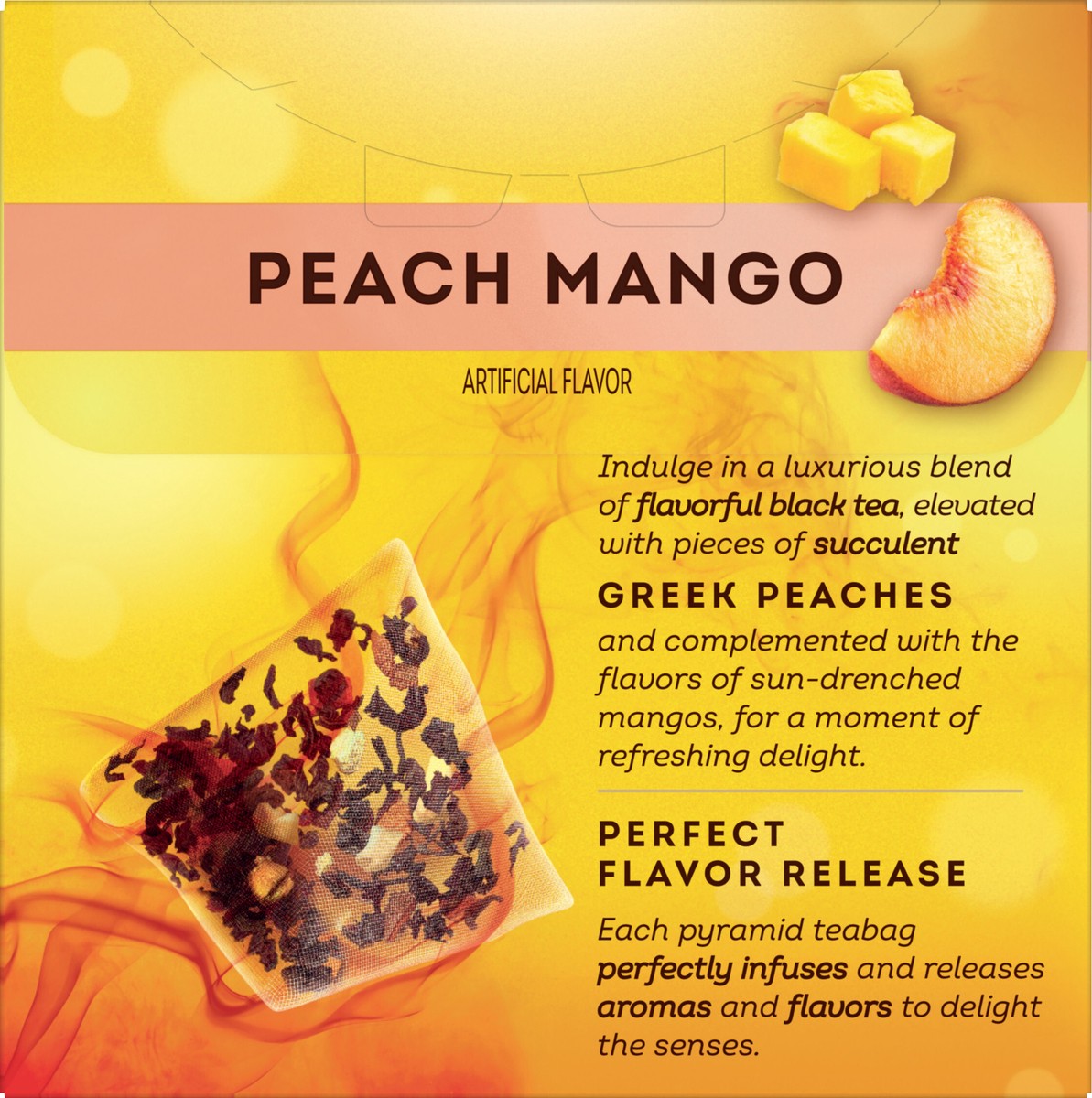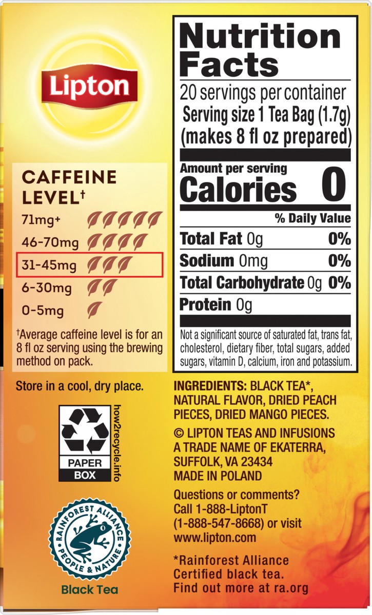 Black Tea (Rainforest Alliance Certified Black Tea. Find Out More at ra.org), Natural Flavor, Dried Peach Pieces, Dried Mango Pieces.