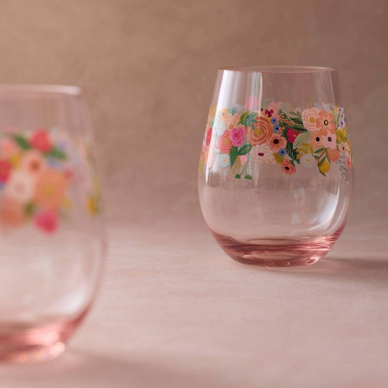 - Clear pink glasses illustrated with Rifle Paper Co.'s best selling Garden Party florals, originally painted by cofounder Anna Bond