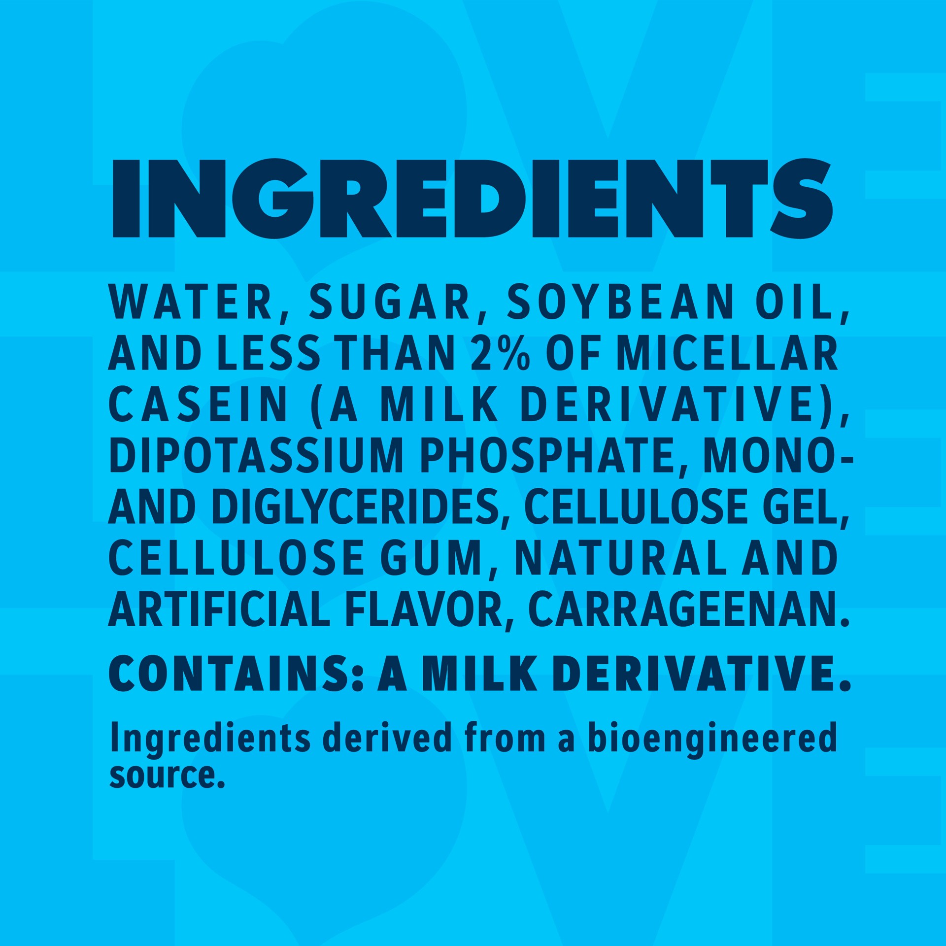 WATER, SUGAR, SOYBEAN OIL, AND LESS THAN 2% OF DIPOTASSIUM PHOSPHATE, MICELLAR CASEIN (A MILK DERIVATIVE), MONO- AND DIGLYCERIDES, CELLULOSE GEL, CELLULOSE GUM, CARRAGEENAN, NATURAL & ARTIFICIAL F…