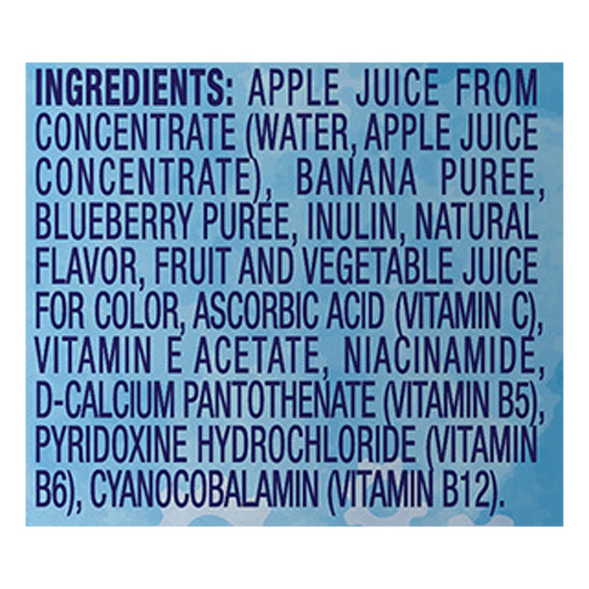 Apple Juice from Concentrate (Water, Apple Juice Concentrate), Banana Puree, Blueberry Puree, Inulin, Natural Flavor, Fruit and Vegetable Juice for Color, Ascorbic Acid (Vitamin C), Vitamin E Acetate,…