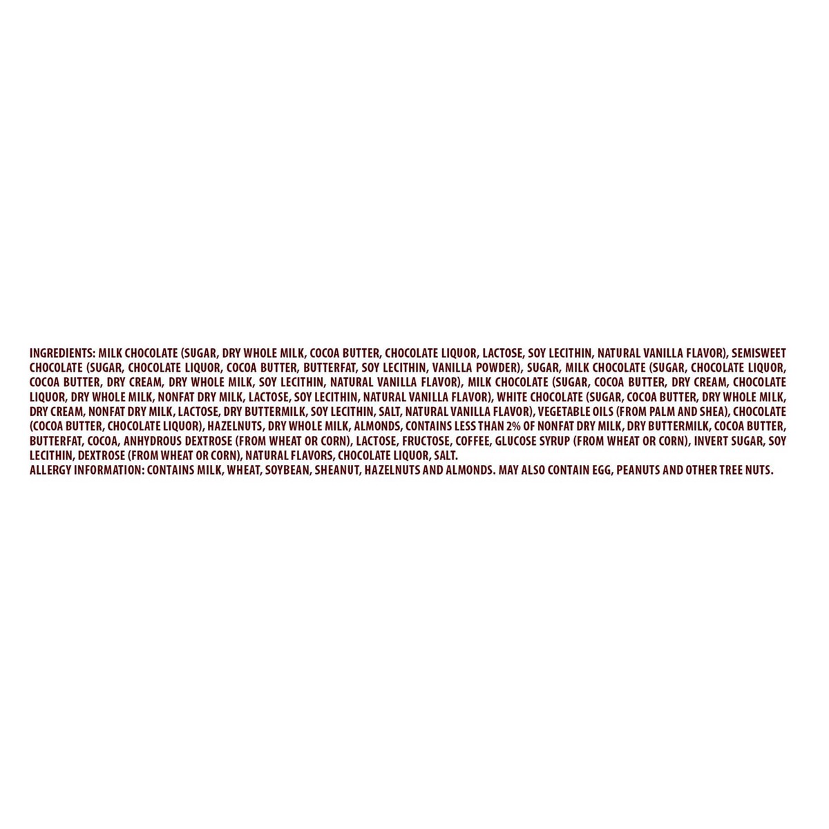 Milk Chocolate (Sugar, Dry Whole Milk, Cocoa Butter, Chocolate Liquor, Lactose, Soy Lecithin, Natural Vanilla Flavor), Semisweet Chocolate (Sugar, Chocolate Liquor, Cocoa Butter, Butterfat, Soy Lecith…