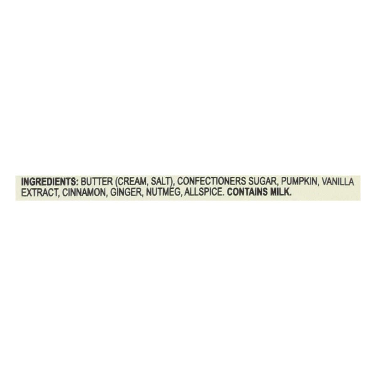 Butter (Cream, Salt), Confectioners Sugar, Pumpkin, Vanilla Extract, Cinnamon, Ginger, Nutmeg, Allspice.