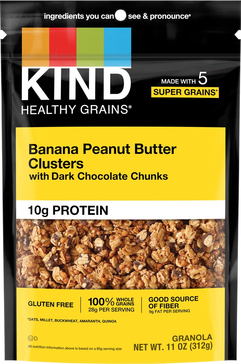 KIND HEALTHY GRAINS Banana Peanut Butter with Dark Chocolate Chunks Whole Grain granola clusters are an all-in-one, convenient, hand-to-mouth tasty mix. KIND HEALTHY GRAINS Banana Peanut Butter with D…
