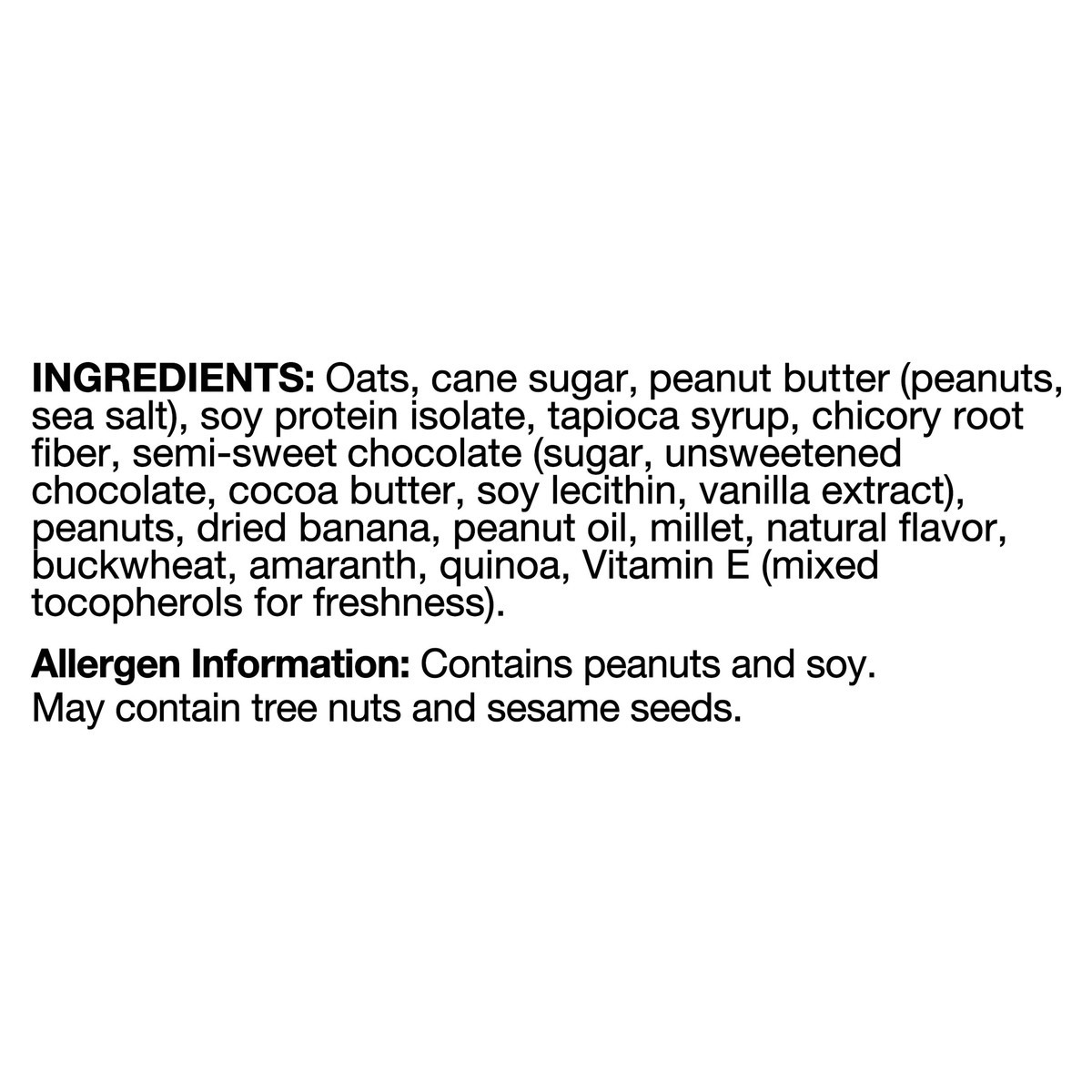 Oats, Cane Sugar, Peanut Butter (Peanuts, Sea Salt), Soy Protein Isolate, Tapioca Syrup, Chicory Root Fiber, Semi-Sweet Chocolate (Sugar, Unsweetened Chocolate, Cocoa Butter, Soy Lecithin, Vanilla Ext…