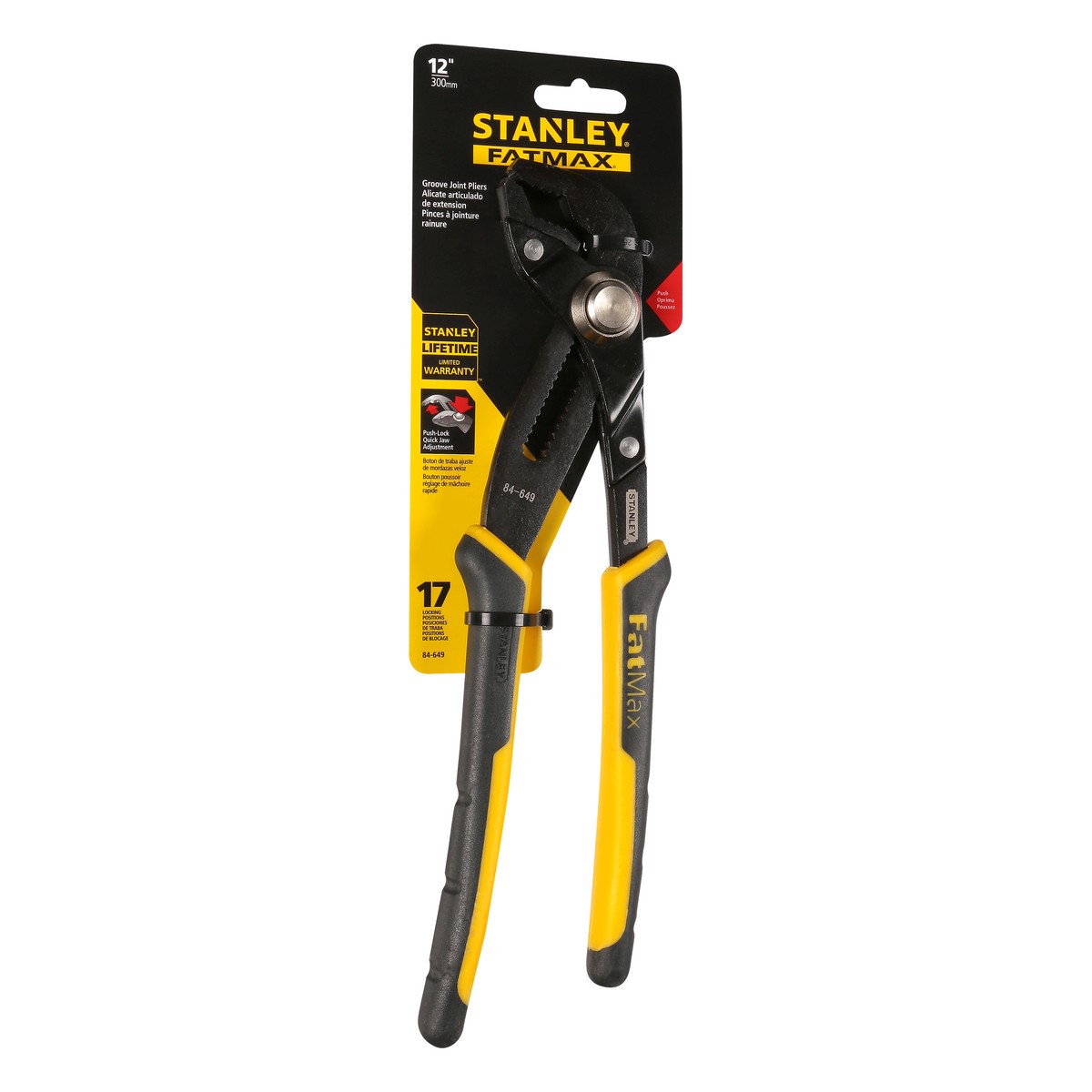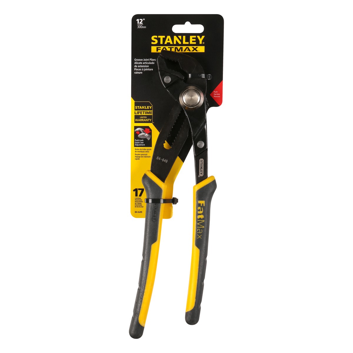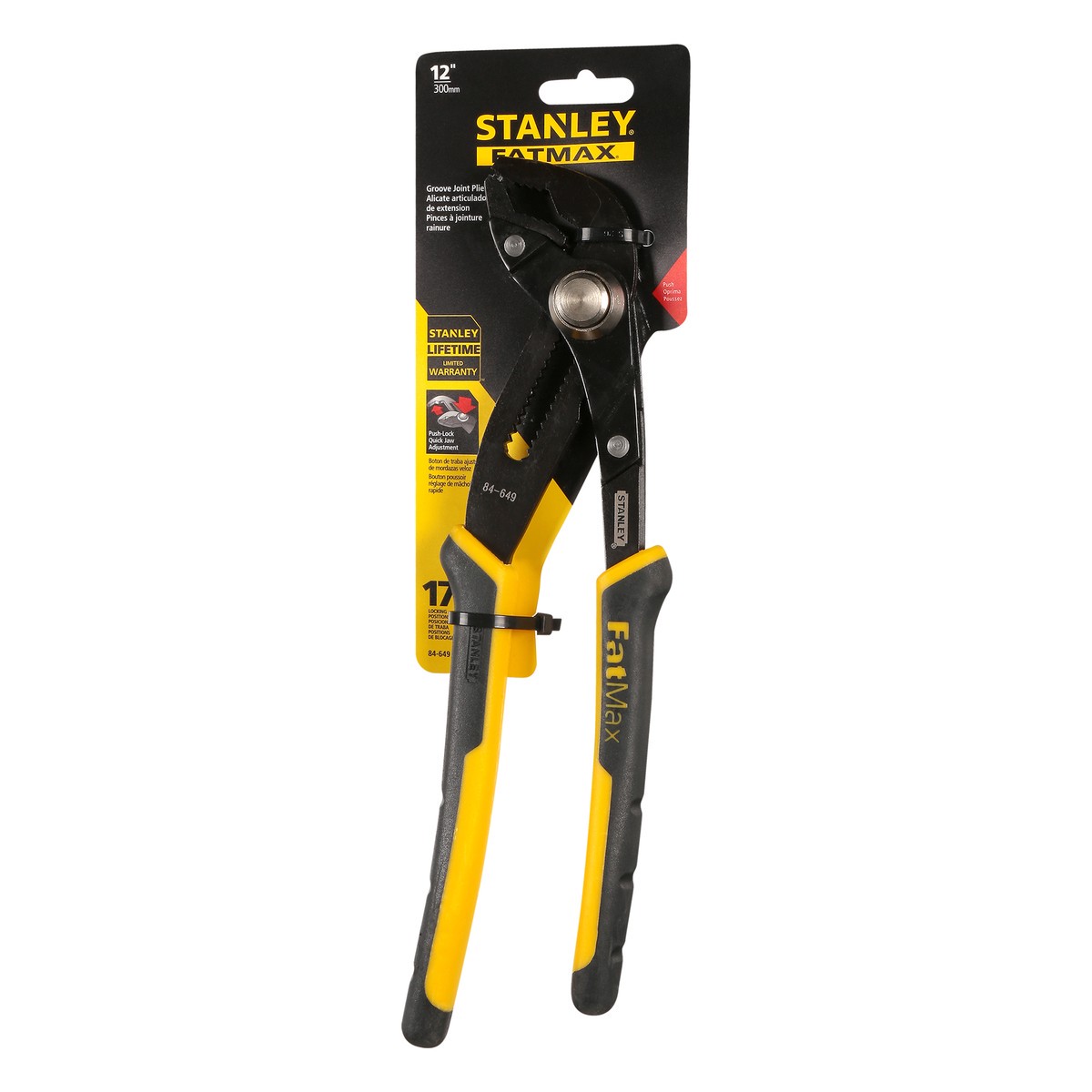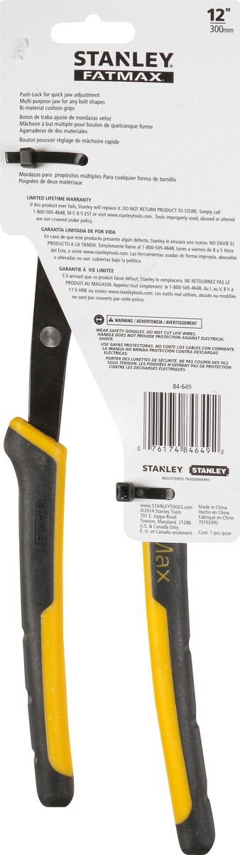 12 Inches (300 mm). 17 Locking positions. U.S & Canada only. Multi-purpose jaw for any bolt shapes. Bi-material cushion grips. www.stanleytools.com. Made in China.