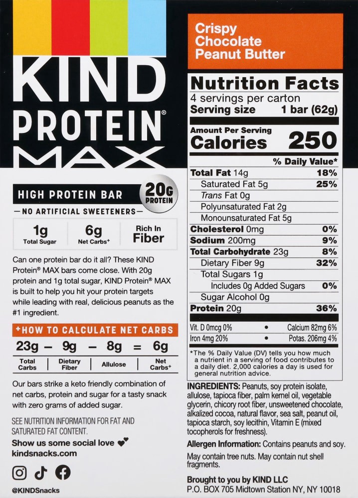 Looking for a snack that is an excellent source of protein, high fiber, and keto friendly? Introducing KIND Protein MAX Crispy Chocolate Peanut Butter Snack Bars. Protein Max bars are individually wra…