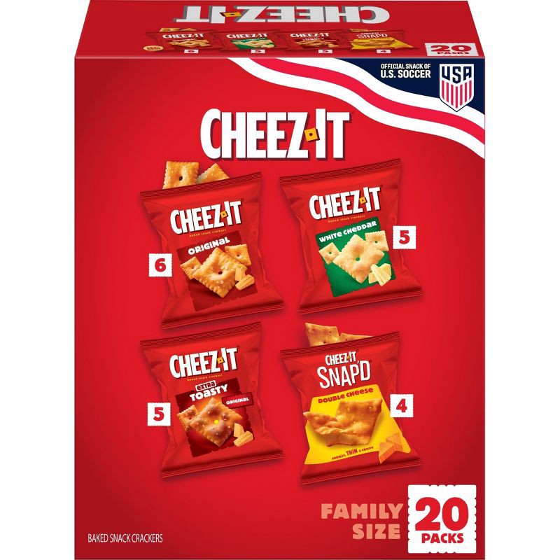 - Variety pack of Cheez-It Original, White Cheddar, and Extra Toasty and Cheez-It Snap'd Double Cheese flavors; Deliciously cheesy and crispy crackers