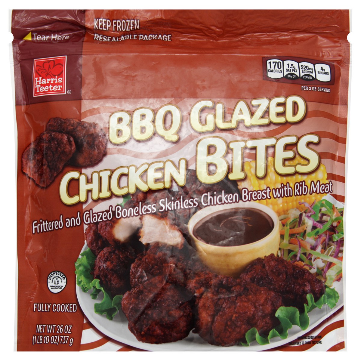 Frittered and glazed boneless skinless chicken breast with rib meat. Inspected for wholesomeness by US Department of Agriculture. Fully cooked. 170 calories\, 1.5 g sat fat (8% DV)\, 520 mg sodium (22…