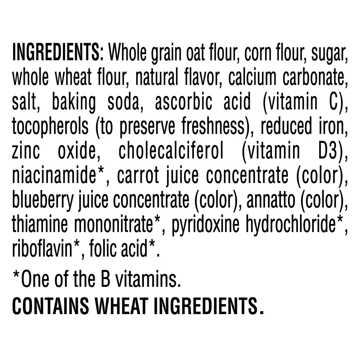 Whole Grain Oat Flour, Corn Flour, Sugar, Whole Wheat Flour, Natural Flavor, Calcium Carbonate, Salt, Baking Soda, Ascorbic Acid (Vitamin C), Tocopherols (to Preserve Freshness), Reduced Iron, Zinc Ox…